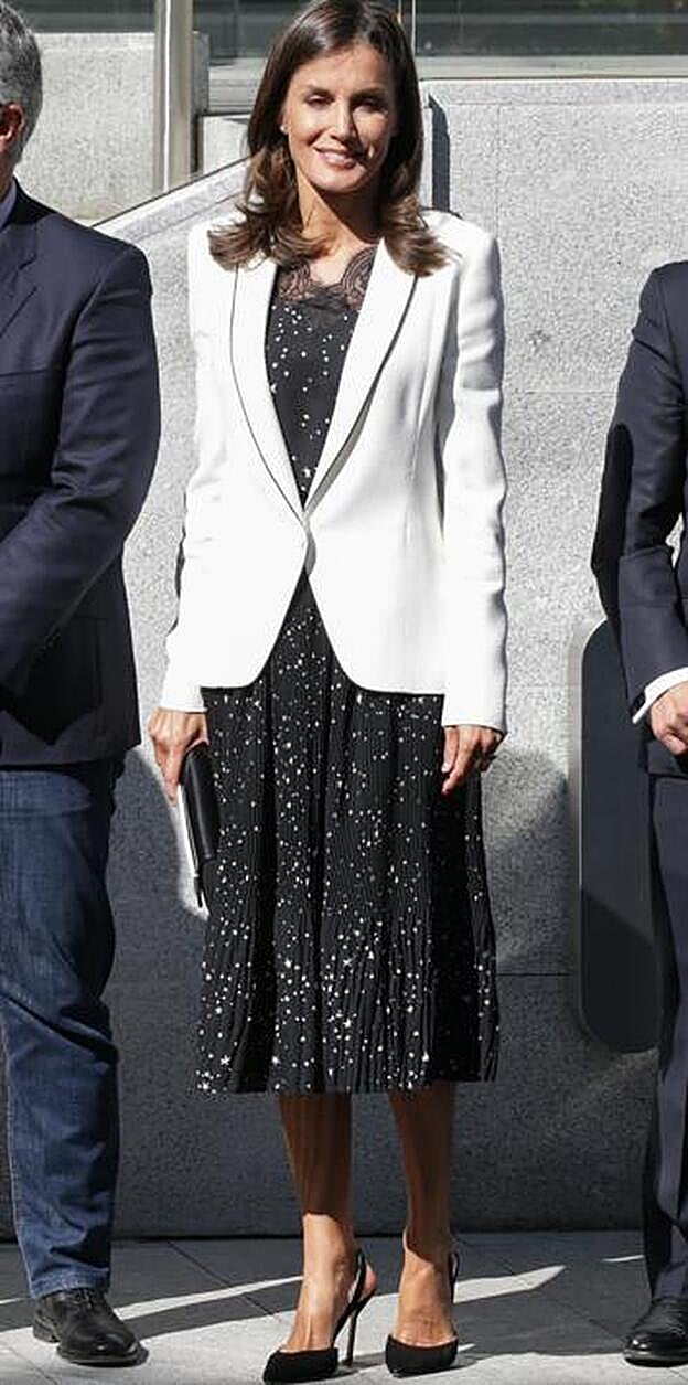Nos encanta el dos piezas de top lencero y falda midi de Poète, una firma que la Reina luce por primera vez. Nos encanta su microplisado negro con detalle de blonda en el escote y ese estampado blanco que, a primera vista parece de lunares, pero que con una mirada detallada resultan ser estrellas. Nos encanta su blazer pijamera blanca con ribete negro, que estrenó el verano de 2018 en un acto en Mérida, aunque las mangas le quedan ligeramente largas y necesitaría un arreglo. Y, por supuesto, nos encantan sus zapatos de ante destalonados (que tiene igual en azul marino y en beige). Sin embargo, el efecto de la americana ligeramente oversize sobre ese vestido hace que tanto una prenda como la otra pierdan su esencia y no conformen ese conjunto 'black&white' perfecto que, seguro, imaginaron la doña Letizia y su estilista al crear este look.