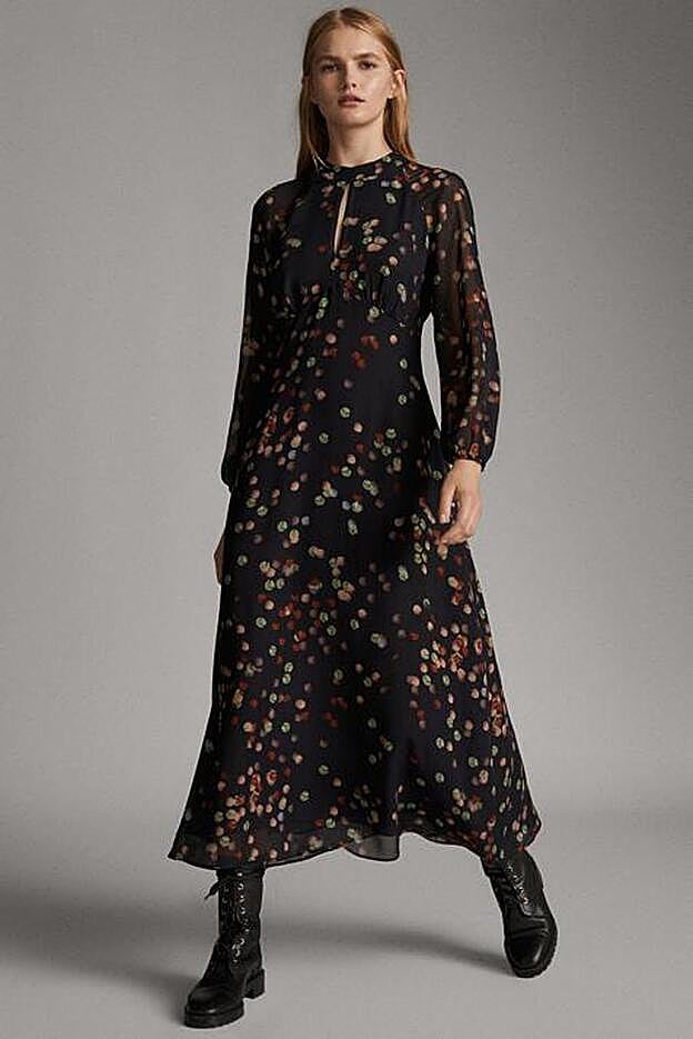 La Reina ha estrenado un vestido midi de viscosa negro con estampado en tonos verdes, rojos y maquillaje a modo de pinceladas. Con un favorecedor escote redondo con abertura tanto delantera como trasera, cintura marcada y mangas con ligero volumen, este nuevo diseño de Massimo Dutti cuesta 99.95 euros y aún está disponible en todas las tallas (de la 34 a la 42).