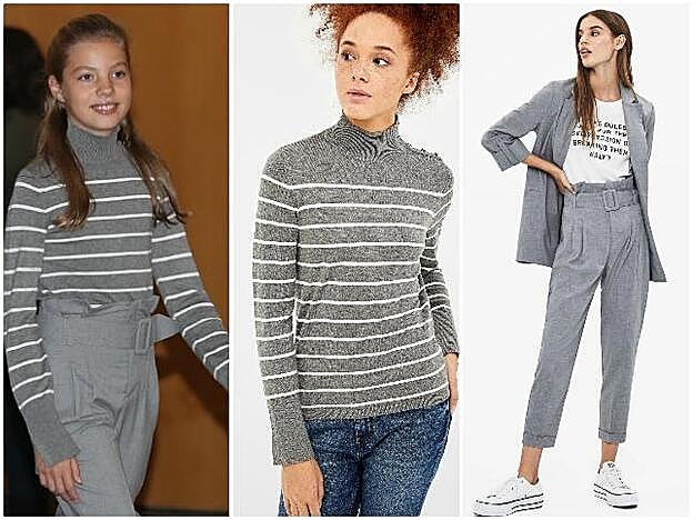 Para acompañar a don Felipe, doña Letizia y la Princesa Leonor en uno de los actos de la Fundación Princesa de Girona, la Infanta Sofía lució unos pantalones 'paper bag' gris humo con cintura marcada (perfectos para que cualquiera de nosotras presumamos de tipazo) de Bershka que, además de estar disponibles en varios colores, están rebajados de 19.99 a 11.99 euros en algunas tallas. La hija pequeña de los Reyes los llevó con un suéter de cuello vuelto en el mismo tono con estampado de rayas de Springfield también en oferta (de 24.99 a 17.49 euros) y unas bailarinas azul marino de Pretty Ballerinas.