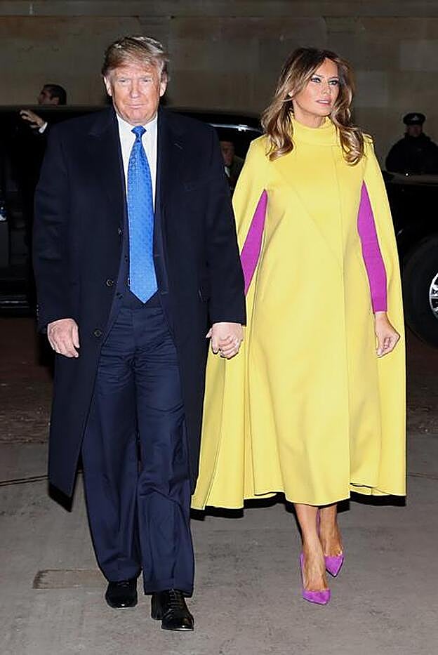 Kate Middleton podría haber sido la invitada más elegante de la noche... si no hubiera estado allí Melania Trump. Y es que la primera dama de EE.UU. llegó y arrasó con un potente (e imponente) look 'color block' con abrigo capa amarillo de Valentino (que supera los 4.500 euros) que combinó con vestido fucsia y altísimos 'stilettos' a juego.