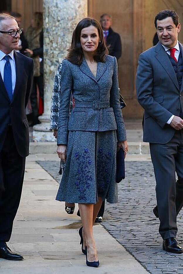 De inspiración 'new look', en cheviot gris bordado a mano en hilo, con chaqueta entallada y falda 'lady' con detalles en azul, la Reina Letizia ha apostado sobre seguro con una silueta que saca lo mejor de su figura, ya que realza el talle, marca la cintura y, combinada con unos salones de empeine abierto, estiliza las piernas.