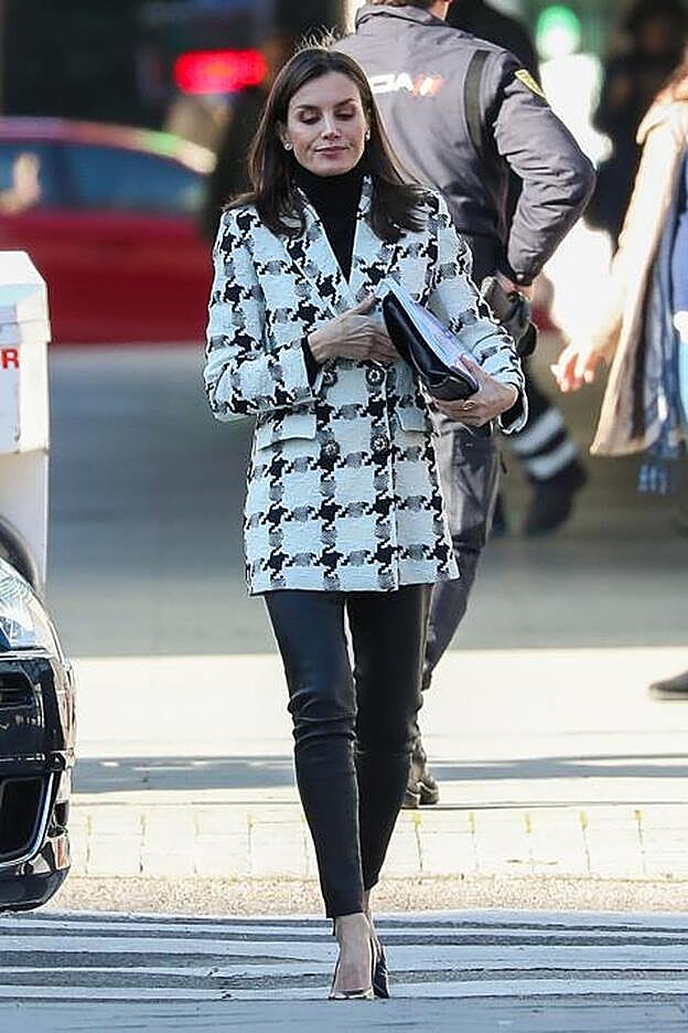 Doña Letizia ha apostado por el binomio infalible de blanco y negro y, con una combinación tan sencilla como favorecedora, ha firmado (en la segunda semana del año) el que sin duda será uno de sus mejores looks 'working girl' de 2020 con una protagonista de excepción: una blazer de tweed con estampado pata de gallo versión XXL y botones joya que bien podría ser de Chanel pero que la firma Uterqüe.