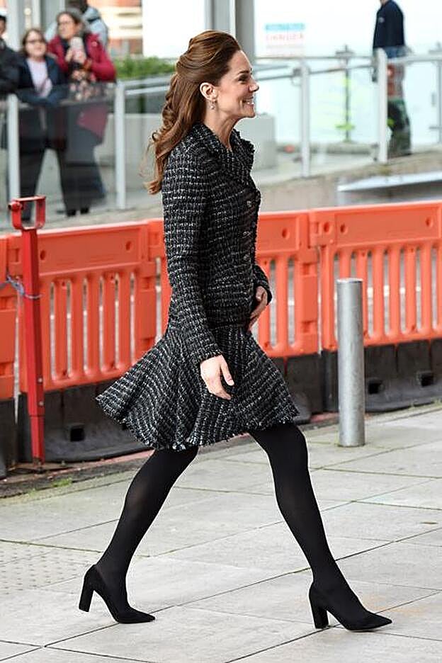 La Duquesa de Cambridge ha reciclado estilismo, y ha vuelto a lucir un dos piezas de tweed de Dolce&Gabbana que estrenó el invierno pasado, y que combina una chaqueta entallada con botones joya y una falda de silueta 'skater'. Sobria, pero muy elegante, Kate Middleton ha llevado su traje con medias negras tupidas y salones de ante de Gianvitto Rossi con un sensato tacón medio.
