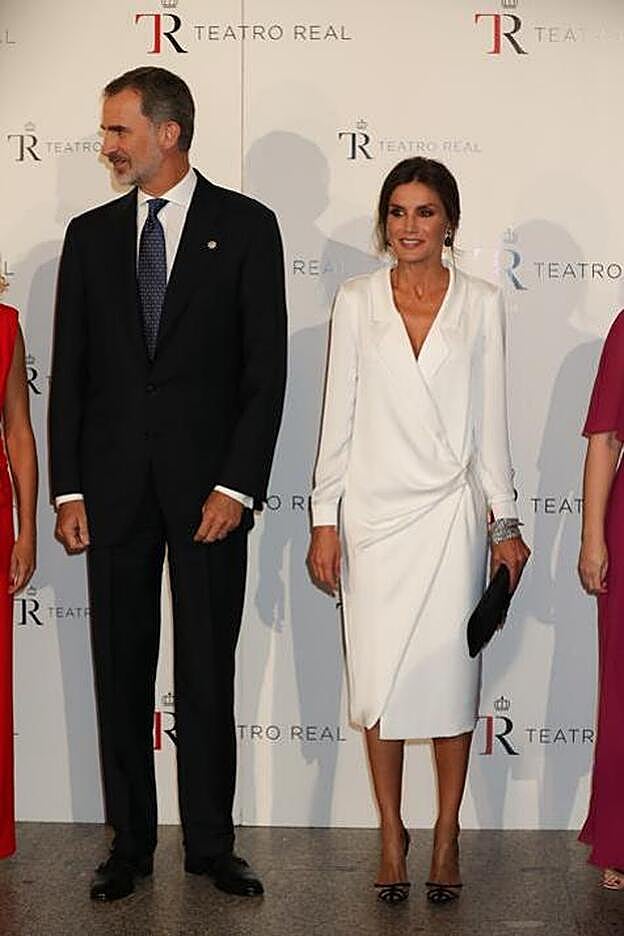 A pesar de que el color fetiche de Doña Letizia es el rojo, la Reina apuesta en muchas ocasiones por el blanco. El pasado año lo hizo para asisitir a la inauguración de la nueva temporada del Teatro Real y acertó con un vestido que recuerda a este último que ha llevado Rania. Era también un diseño tipo blazer con escote en V, solapas y manga larga. Sin embargo, el de Letizia era de Lola Li, una firma española, y tenía la falda cruzada y con corte recto. Letizia también lo combinó con un unos stilettos, pero prefirió hacerlo con complementos negros.