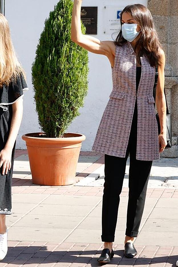 La monarca combinó unos pantalones negros de pinzas con un chaleco de Zara realizado en bouclé en tonos rosados y con cuello geométrico cuyo precio era de 49,95 euros. Prenda que llevó con un top negro debajo y a la que añadió también unos mocasines planos negros, no muy aptos para las altas temperaturas veraniegas, y un bolso negro bandolera de Adolfo Domínguez.