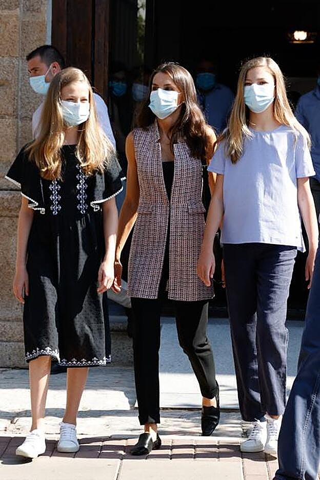Los monarcas y sus hijas fueron fotografiados a la salida del Parador donde se han alojado mientras se despedían de los allí presente. Unas imágenes en las que se puede ver que han escogido looks cómodos para viajar protagonizados por prendas muy baratas que ya habían utilizado en anteriores ocasiones. Doña Letizia sorprendió al dejar a un lado su fórmula repetidísima de la gira por España de vestido con alpargatas de cuña y coleta y optar por un look más formal y muy de oficina.