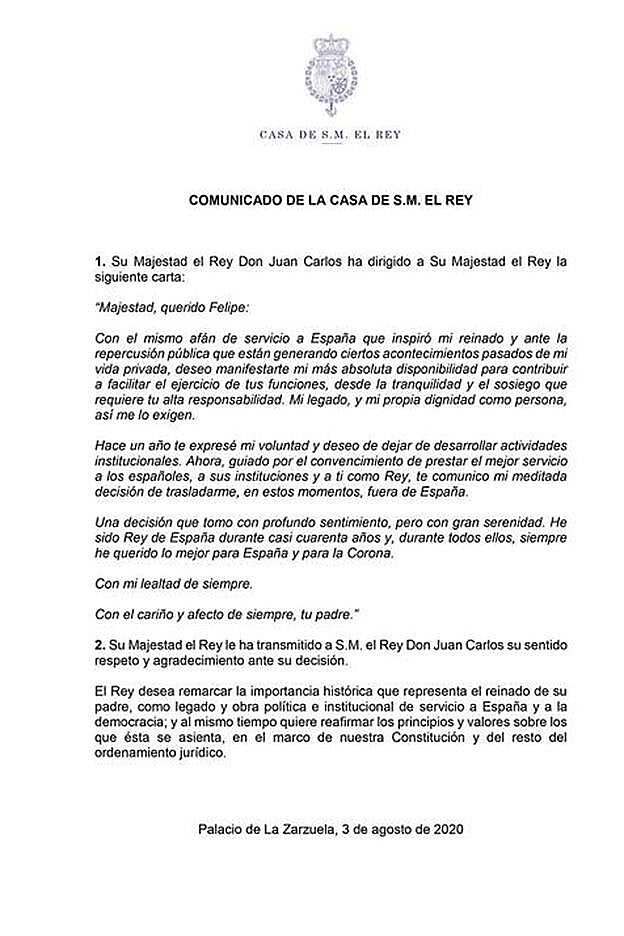 Con el mismo afán de servicio a España que inspiró mi reinado y ante la repercusión pública que están generando ciertos acontecimientos pasados de mi vida privada, deseo manifestarte mi más absoluta disponibilidad para contribuir a facilitar el ejercicio de tus funciones, desde la tranquilidad y el sosiego que requiere tu alta responsabilidad. Mi legado, y mi propia dignidad como persona, así me lo exigen.