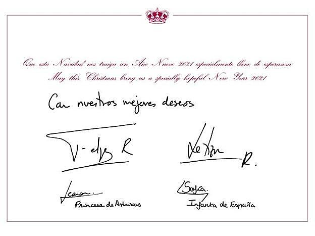 Las dos hermanas aparecen en primer plano posando muy sonrientes junto al bonito paisaje y luciendo el peinado royal más favorecedor. Una imagen que viene acompañada de una tarjeta en la que se puede leer el siguiente deseo: "Que esta Navidad nos traiga un Año Nuevo 2021 especialmente lleno de esperanza". Palabras que firman los Reyes y sus hijas y que van acompañadas de un "con nuestros mejores deseos".