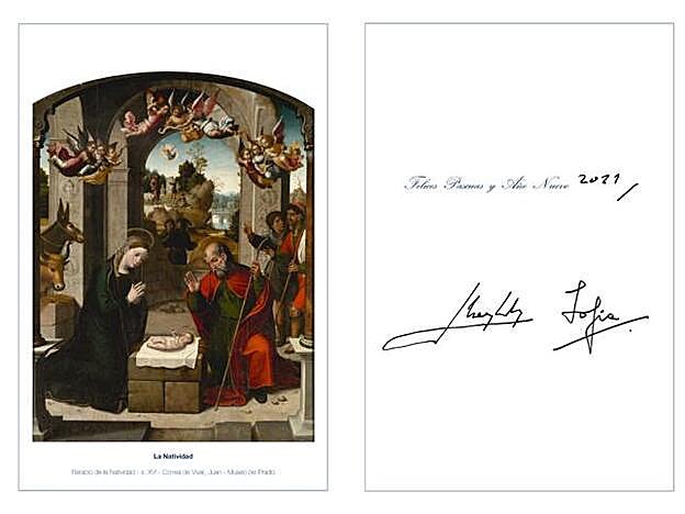 Casa Real también ha difundido la felicitación navideña por parte de los eméritos. Una tarjeta mucho más sencilla en la que han escogido como imagen 'La Natividad', una pintura de Juan Correa de Vivar que se encuentra en el Museo del Prado. Con un escueto "Felices Pascuas y Año Nuevo 2021", Don Juan Carlos y Doña Sofía han querido desear unas buenas fiestas a los españoles. Una firma cargada de polémica después del difícil año para el emérito con los escándalos financieros que le han hecho dejar España.