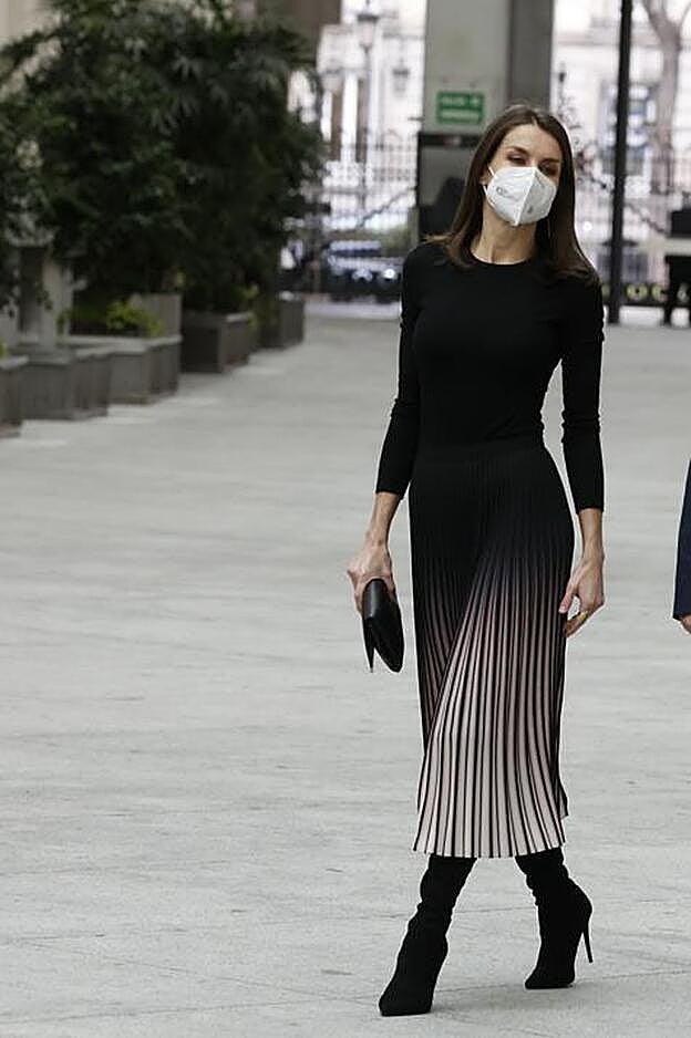 La Reina volvía a repetir look (había lucido una combinación casi idéntica a principios de noviembre) y recuperaba una de las faldas más favorecedoras que tiene: un modelo midi plisado de la firma Reiss que estiliza la silueta y que, en esta ocasión, combinaba con un suéter negro ajustado y dos de sus complementos fetiche, el cinturón de Burberry y sus botas 'over the knee' de Steve Madden.