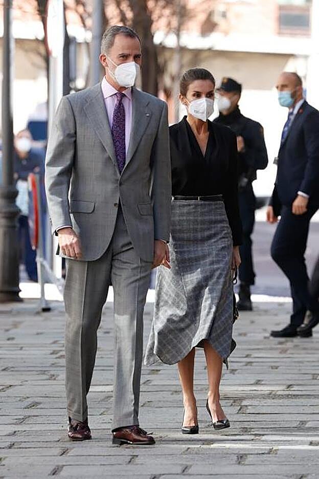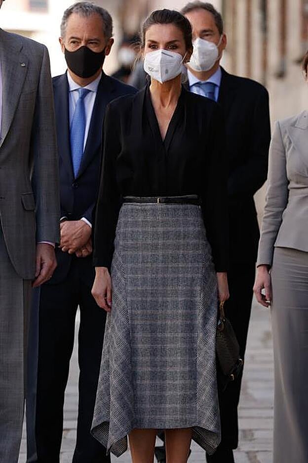 Massimo Dutti se ha convertido en la marca 'low cost' fetiche de la Reina, desbancando a Zara y Mango de su fondo de armario. En las últimas semanas, lo hemos podido comprobar con esta falda midi plisada súper favorecedora, con un nuevo vestido rojo que se convirtió en la mejor compra de la temporada o recuperando este look con mensaje que había estrenado un par de años antes. Ahora, le ha tocado el turno a otra falda midi, esta vez un modelo de estampado de cuadros en tonos grises con cintura marcada y bajo asimétrico que estrenó en FITUR en enero de 2019 y, desde entonces, ha lucido en varias ocasiones más.