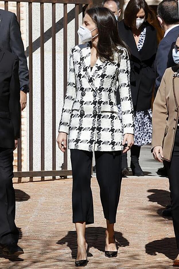 La Reina ha presidido en Toledo el acto de proclamación del ganador del Premio Fundación Princesa de Girona 2021 en la categoría de Empresa y allí la hemos visto con un look repetido que, sin embargo, está de plena tendencia. Para sumarse a la tendencia que arrasa durante el entretiempo, Doña Letizia ha recuperado la que, sin duda, es su americana más bonita: una impresionante blazer con estampado de cuadros pata de gallo en blanco y negro y botones joya de Uterqüe que estrenó en noviembre de 2019 durante su viaje a Cuba y que, cada vez que ha lucido, nos ha enamorado (costaba 179 euros, era de una colección cápsula y se agotó en horas).