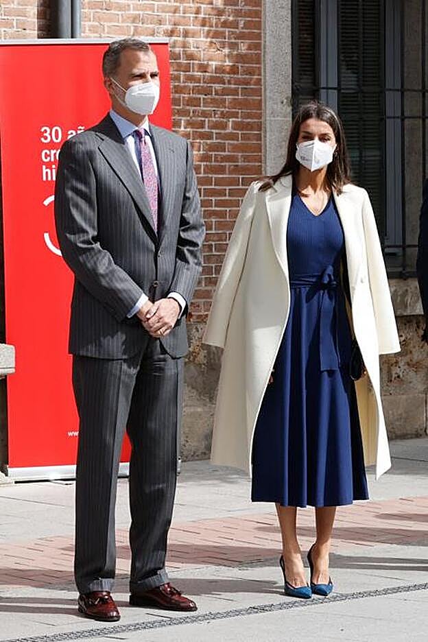 Con un abrigo blanco de entretiempo por los hombros, la Reina ha completado su look con sus salones de print de serpiente en color azul de Magrit y clutch a juego.