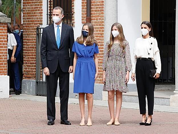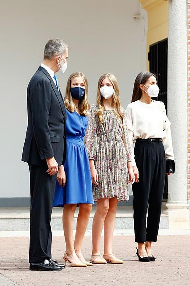 La gran protagonista del día era Leonor y todas teníamos claro que, como en sus últimas apariciones públicas, iba a eclipsar a su madre. Esta vez la Reina se lo ha puesto fácil. Según había marcado el colegio, los alumnos confirmantes podían acudir a recibir el sacramento sin el uniforme de la escuela, pero el 'dress code' exigía "un traje sobrio y formal o un vestido sencillo". Leonor ha aparecido con un vestido azul (el color de los la Princesa de Asturias) liso por la rodilla con cintura marcada que, si bien no es su mejor look, es más acorde a su edad que, por ejemplo, la elección que hizo en los últimos Premios Princesa de Asturias. Como complementos, unos salones de tacón sensato en charol beige de Mascaró (estos sí, los mismos que lució el pasado octubre en Oviedo).