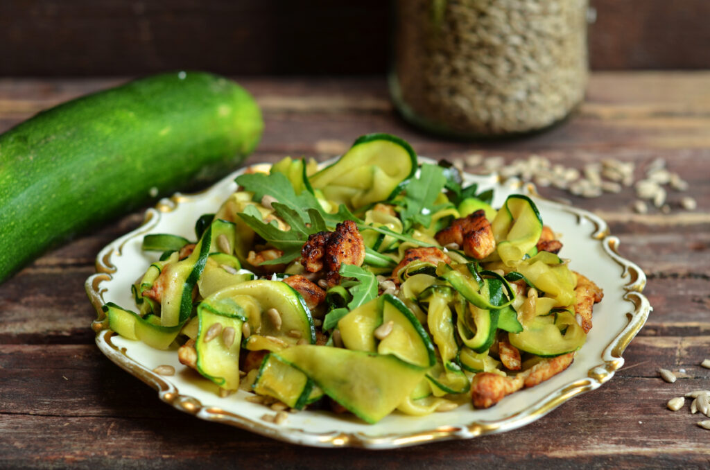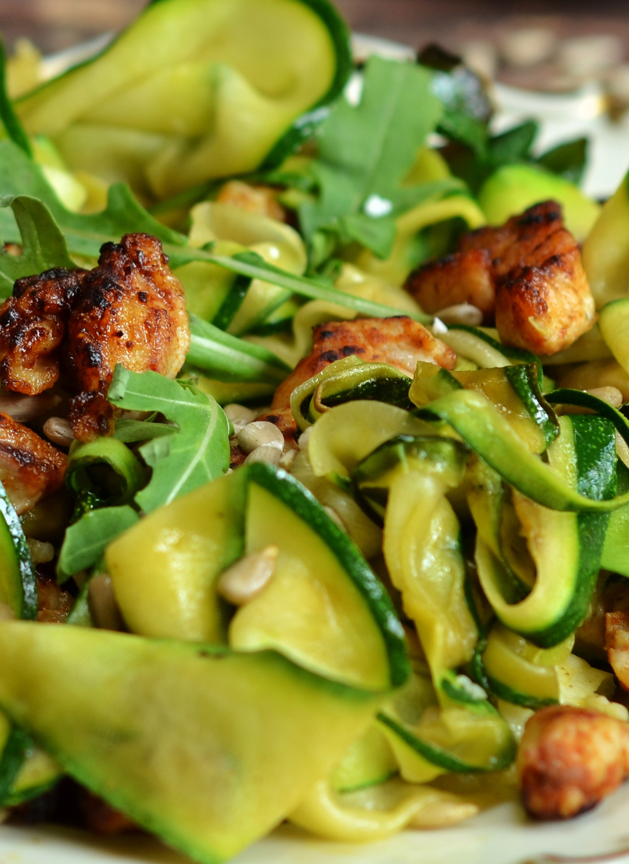 Ensalada templada de calabacín y pollo con pipas