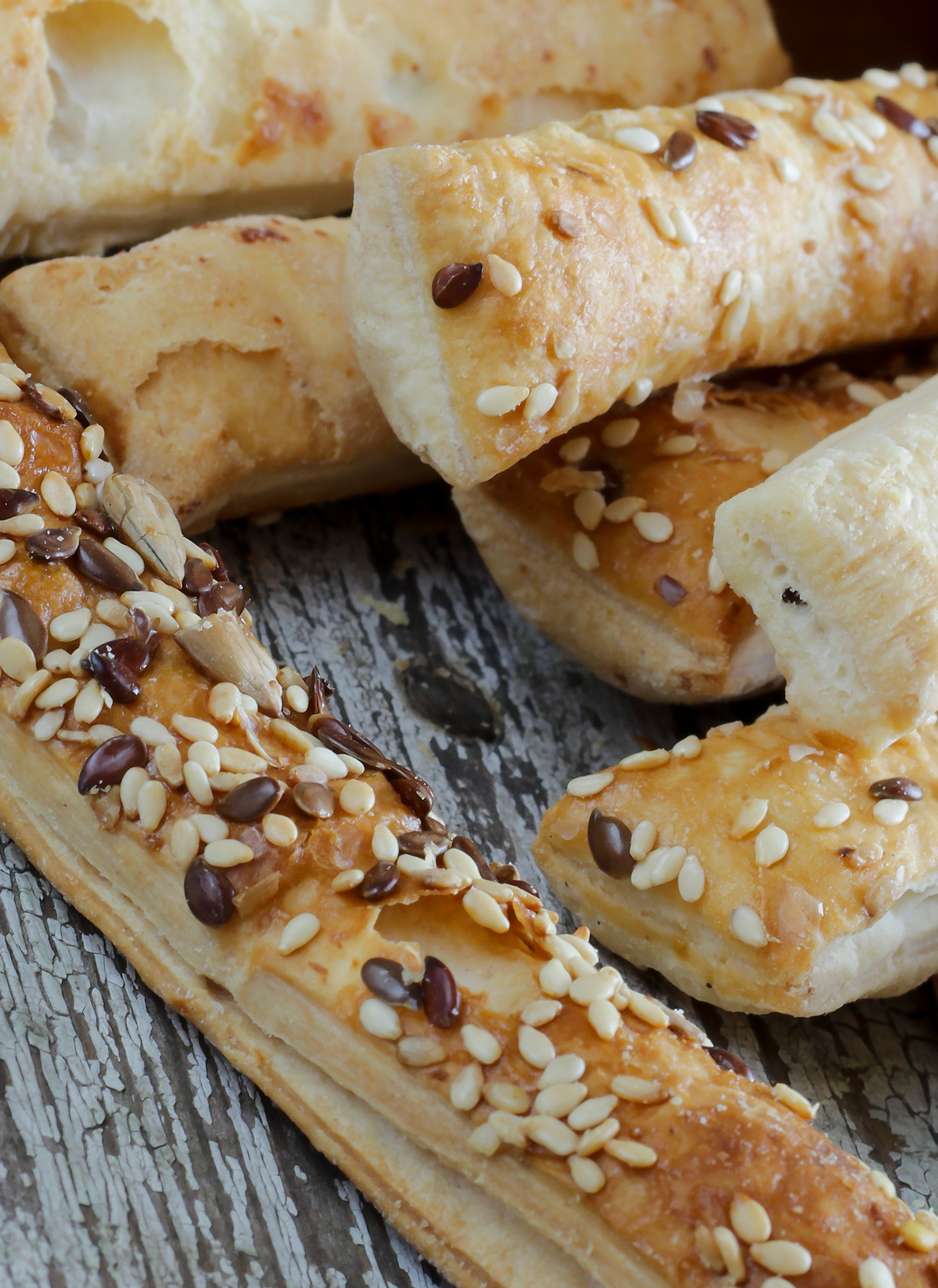 Una vez preparadas las tiras de pan, sólo hay que colocarlas sobre una bandeja con papel de horno, pincelar con un poco de aceite de oliva para darles brillo y colocar algunas pipas enteras por encima de cada palito para decorar. El truco está en repartirlas bien, presionándolas un poco para que queden bien adheridas. Hornear a 200 ºC durante 8-10 minutos –o hasta que estén doraditos– y dejar enfriar para que queden crujientes. Se pueden conservar en un recipiente hermético durante varios días.