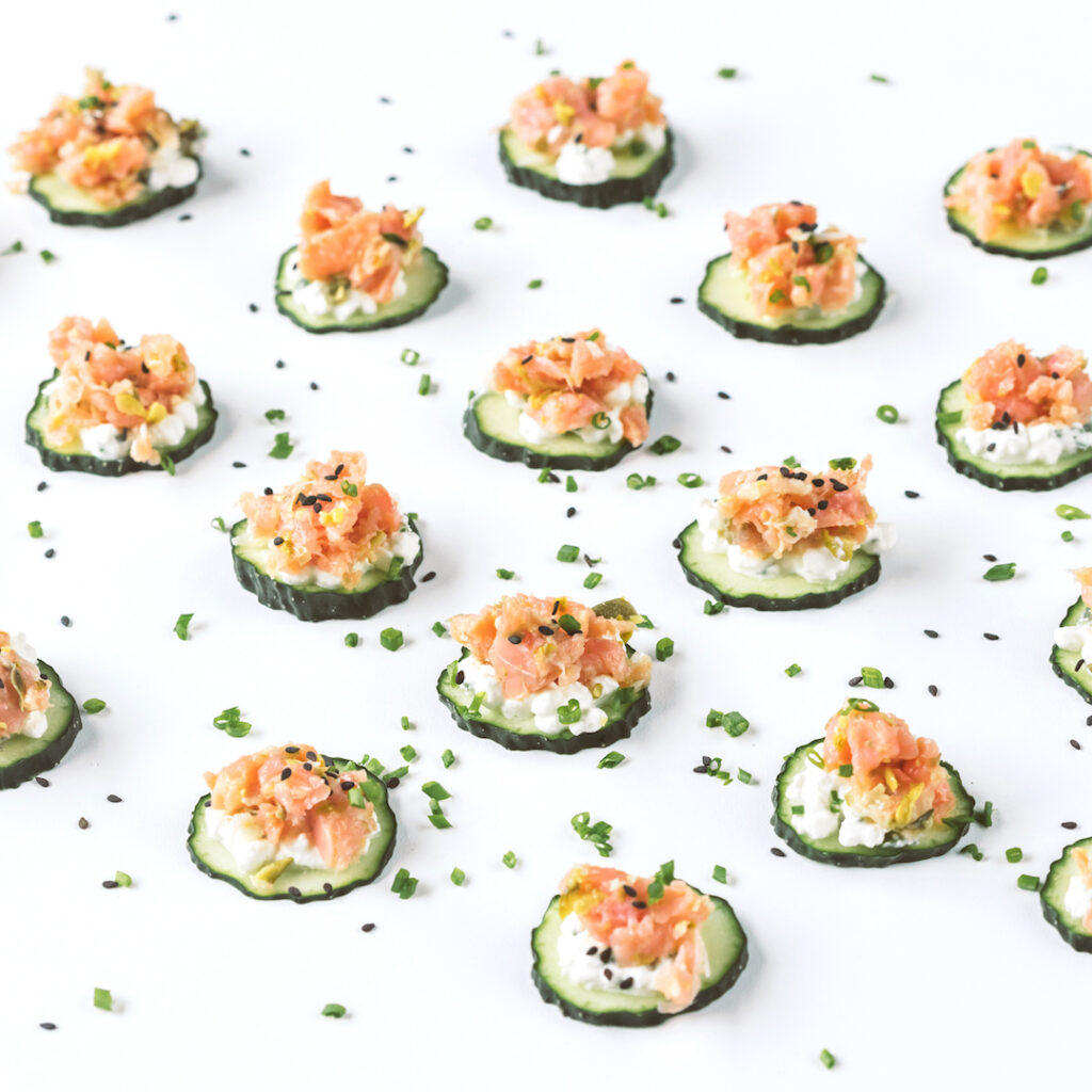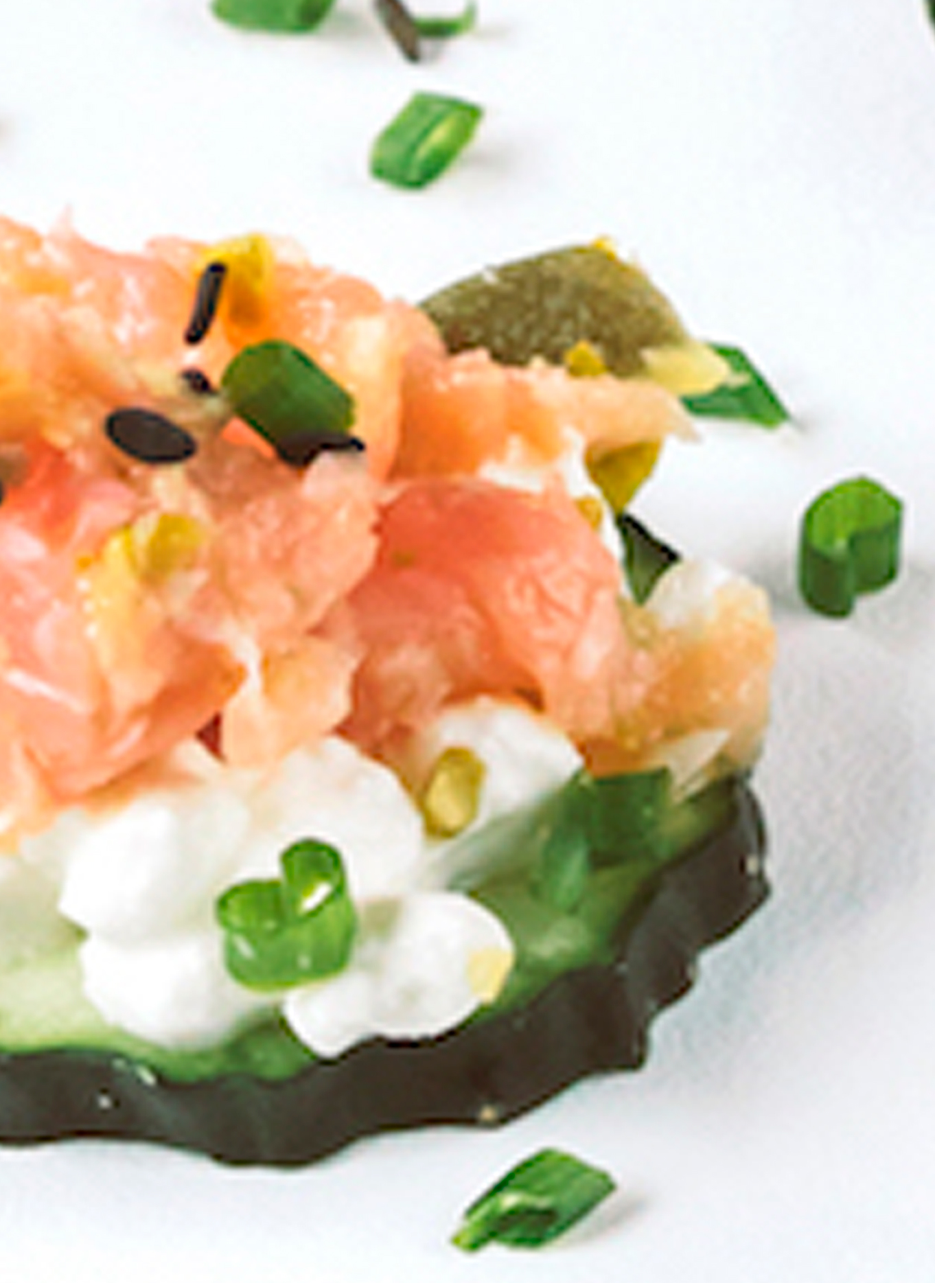 Mezclar en un recipiente hondo el queso cottage y el cebollino finamente picado. Preparar el tratar de salmón. Para emplatar, cortar el pepino –sin pelar pero bien limpio–en finas rodajas y colocar sobre éstas una cucharadita de la mezcla del queso cottage. Por último poner una segunda capa encima con el tartar de salmón y terminar con semillas de sésamo y más cebollino picado.