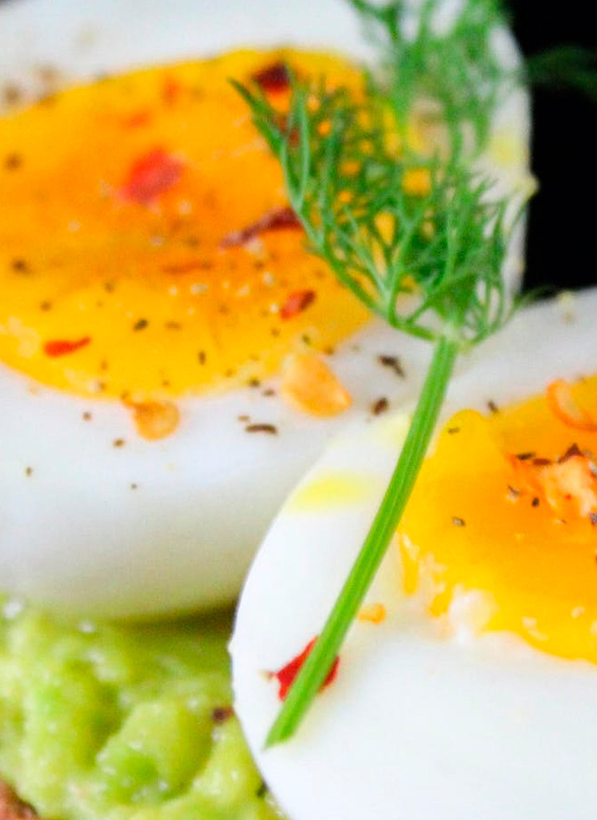 Cocer los huevos de ocho a diez minutos –el tiempo dependerá de lo cocida que se desee la yema–. Una vez listos, separar las claras y reservarlas. Poner las yemas en un recipiente y aplastarlas con ayuda de un tenedor. Una vez trituradas, mezclarlas con el aguacate ya pelado, la mostaza y salpimentar. Unificar todo bien, hasta que quede una mezcla homogénea. Una vez conseguida, rellenar los huevos con la mezcla y colocar las cintas de salmón troceadas sobre este relleno. Para conseguir un toque crujiente y diferente, decorar con granos de granada al gusto.