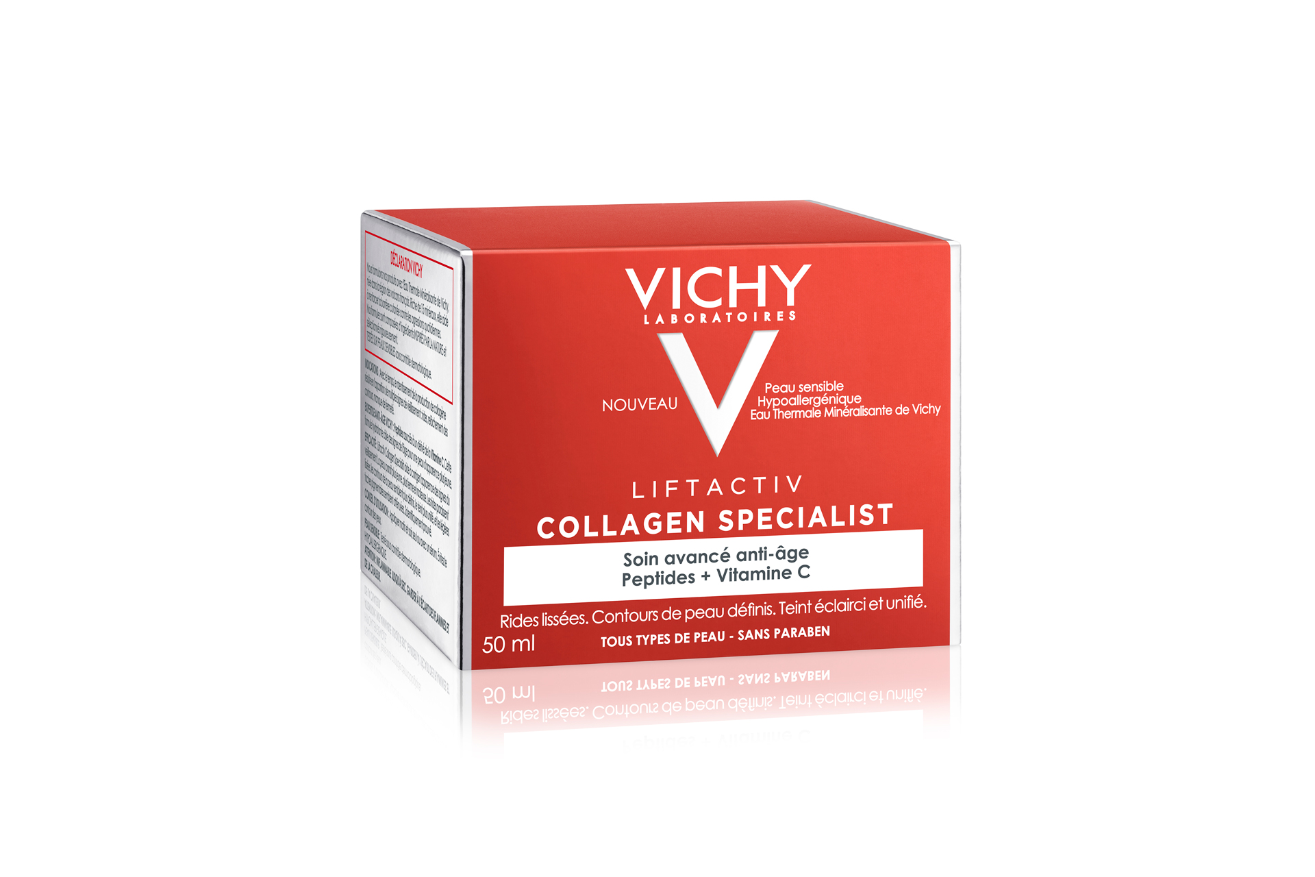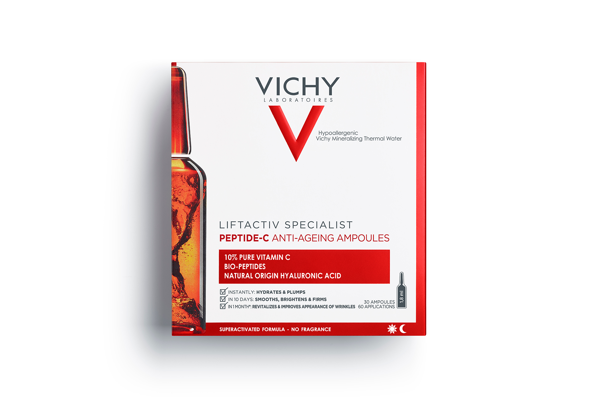 El Protocolo Collagen-Pro de Vichy está formado por dos productos que tienes que incluir en tu rutina de belleza ya que combina Vitamina C, con propiedades antioxidantes para mejorar la elasticidad de la piel, y péptidos, un potente antiarrugas con propiedades antiedad. Ambos activos, en combinación, actúan para corregir visiblemente los signos de la pérdida de colágeno en la piel. Por un lado, las Ampollas Liftactiv Peptide-C, formuladas con 10% de Vitamina C pura junto a biopéptidos antiedad, ácido hialurónico de origen natural y agua volcánica de Vichy, son perfectas tras la limpieza y el sérum por su fórmula antioxidante y antipolución. Consiguen en apenas cuatro horas mejorar la firmeza e hidratación de la piel, pero además, con su uso continuado, reduce un 11,5% el número de arrugas, un 13% su longitud y un 15% su superficie.*
