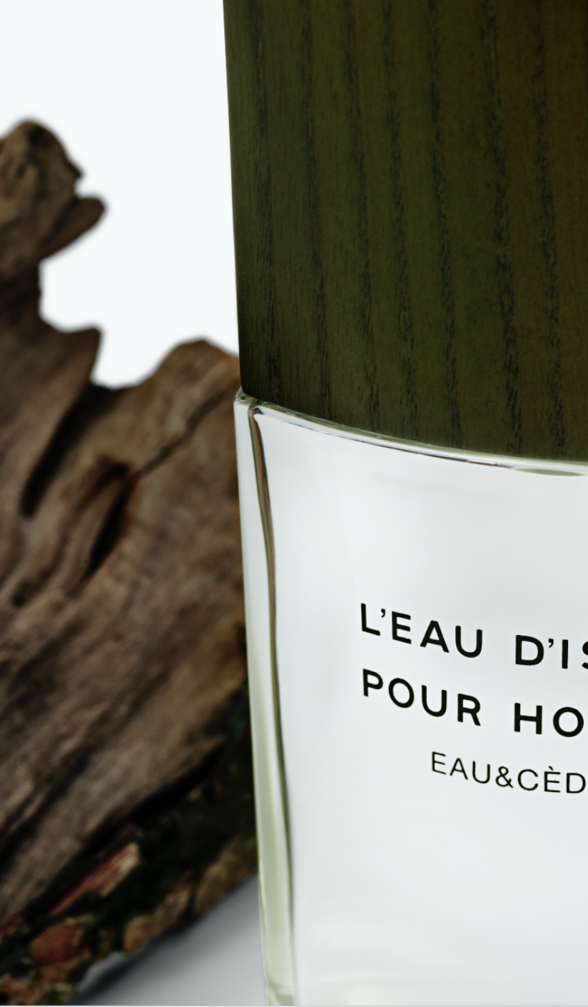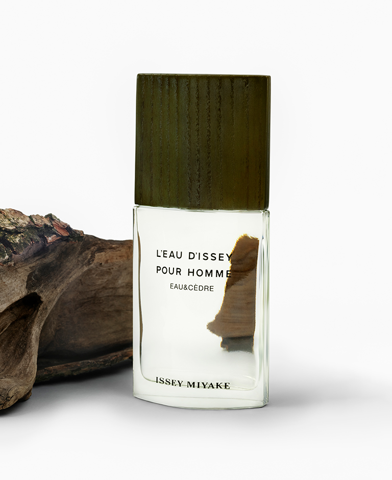 Con L’Eau D’Issey pour Homme Eau & Cèdre, Issey Miyake ha ido un paso más allá al explicitar el contraste entre los elementos trabajando la madera en bruto. Por primera vez, los tapones clásicos se sustituyen por auténticas piezas de madera originales, con su color y veta naturales, lo que las hace únicas y diferentes entre sí. La sublimación llega en forma de encuentro entre el agua y la naturaleza, dibujando unos frascos suaves y translúcidos, coronados con tapones potentes y texturizados al tacto, en color caqui emulando la madera del cedro. Después de treinta años, la belleza y vigencia de estos frascos esenciales permanece intacta revelándose más contemporáneos que nunca.