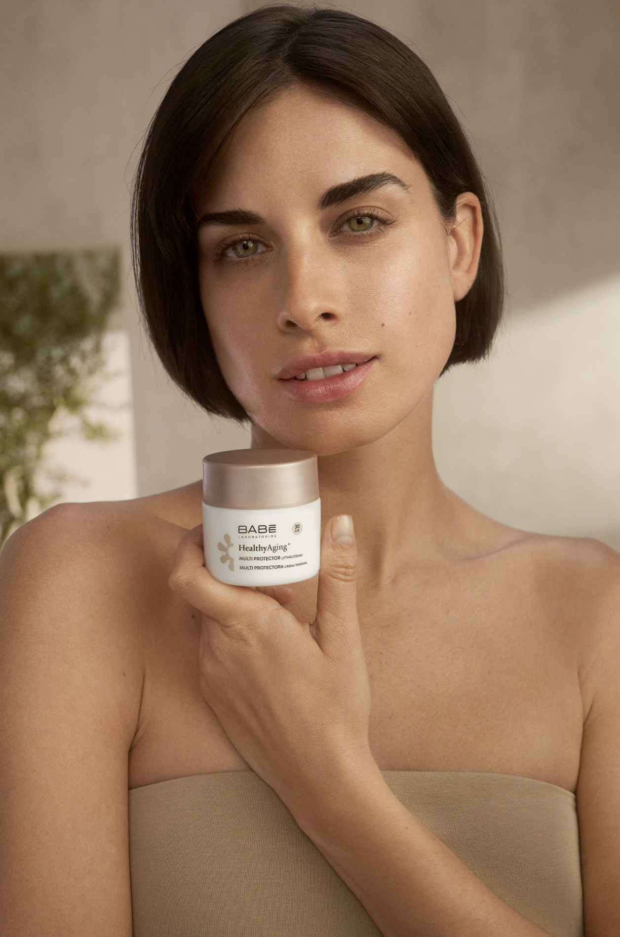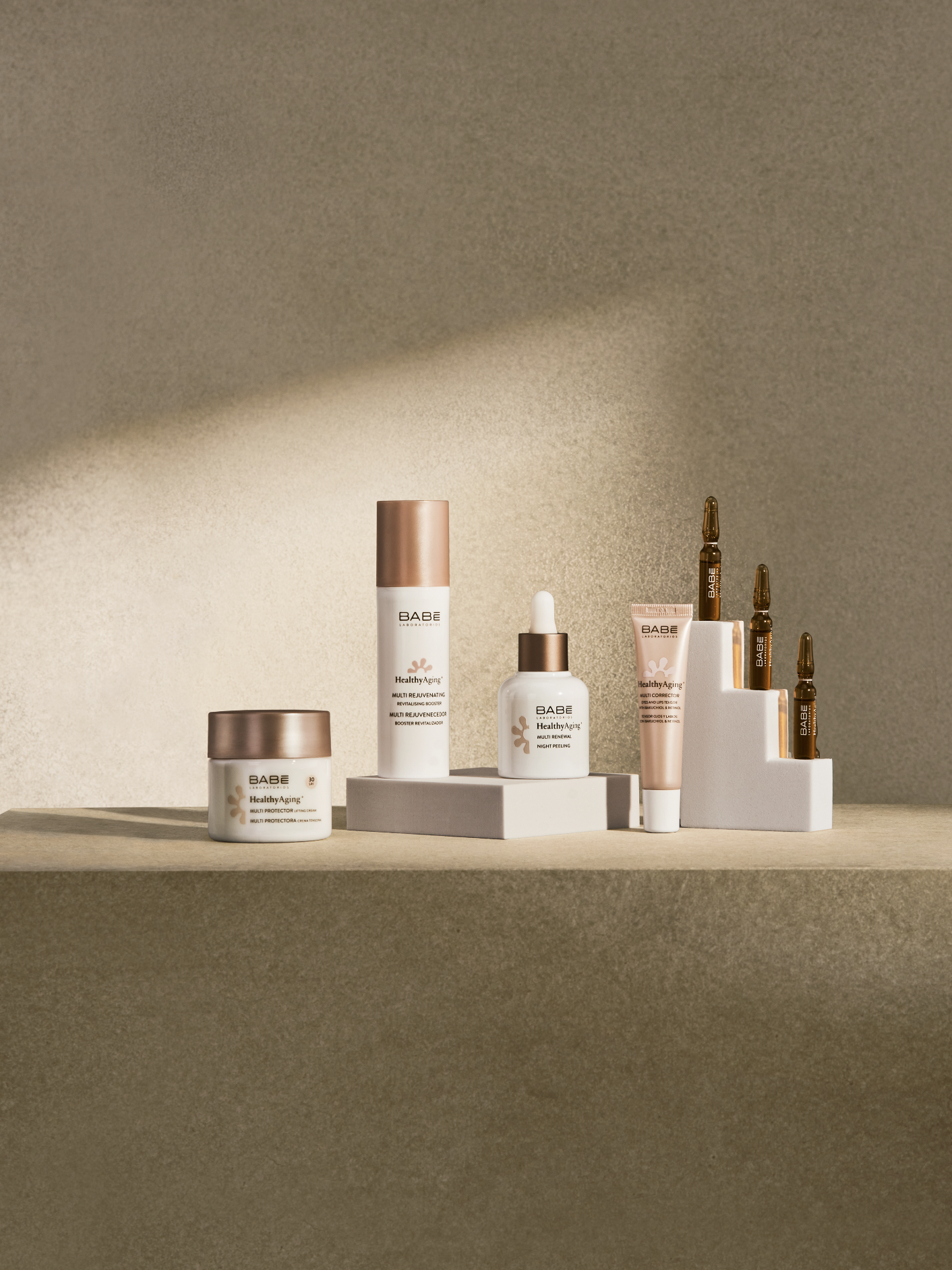 ¿Sabías que nuestro estilo de vida es el responsable del 75% de nuestro proceso de envejecimiento? Incorporar hábitos saludables es lo mejor que puedes hacer por tu piel. BABÉ te ayuda con la piel de tu rostro gracias a la línea integral HealthyAging+, con acción protectora, correctora y preventiva. Perfecta para usarla a cualquier edad. Su secreto es que es capaz de proteger la piel frente a los daños del exposoma que causa el envejecimiento cutáneo, corrigiendo de este modo arrugas, flacidez o falta de uniformidad. Por tanto, HealthyAging+ es una solución integral para el envejecimiento cutáneo que ofrece productos basados en los activos más eficaces, avalados e innovadores frente a los signos del envejecimiento. Para que tu rutina sea completa al 100% puedes empezar utilizando la crema tensora de día, que actúa frente a los rayos solares y la contaminación; la de noche, para activar la regeneración cutánea y corregir las arrugas, o el tensor de ojos y labios, formulado con cafeína, ácido hialurónico y retinol para cuidar unas de las zonas más delicadas del cuerpo y expuestas a la pérdida de elasticidad como son el contorno de ojos y los labios.