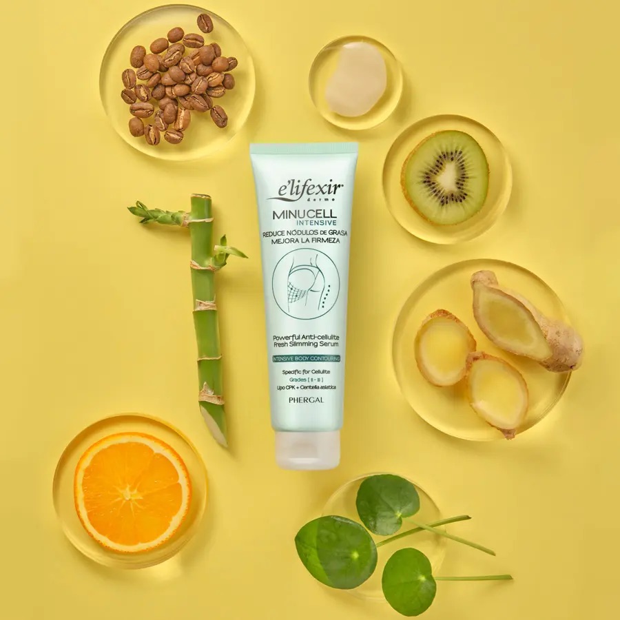 La mejor forma de cerrar el ritual es con e'lifexir Minucell Intesive Sérum, formulado con agua frutal de Bio Kiwi, Bambú, Naranja y Aceite de Jengibre, que ayuda a activar la microcirculación; con cafeína y carnitina; y con Centella Asiática Extracto Seco, Meadowfoam Seed Oil y Creatina, que controlan la formación de las fibras de colágeno y elastina y eliminan los líquidos y toxinas sobrantes.
