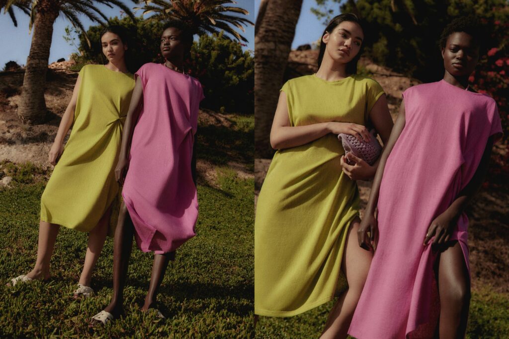 Piezas confeccionadas con tejidos respetuosos con el medio ambiente donde también aterrizan tonos lisos ácidos y estampados florales.