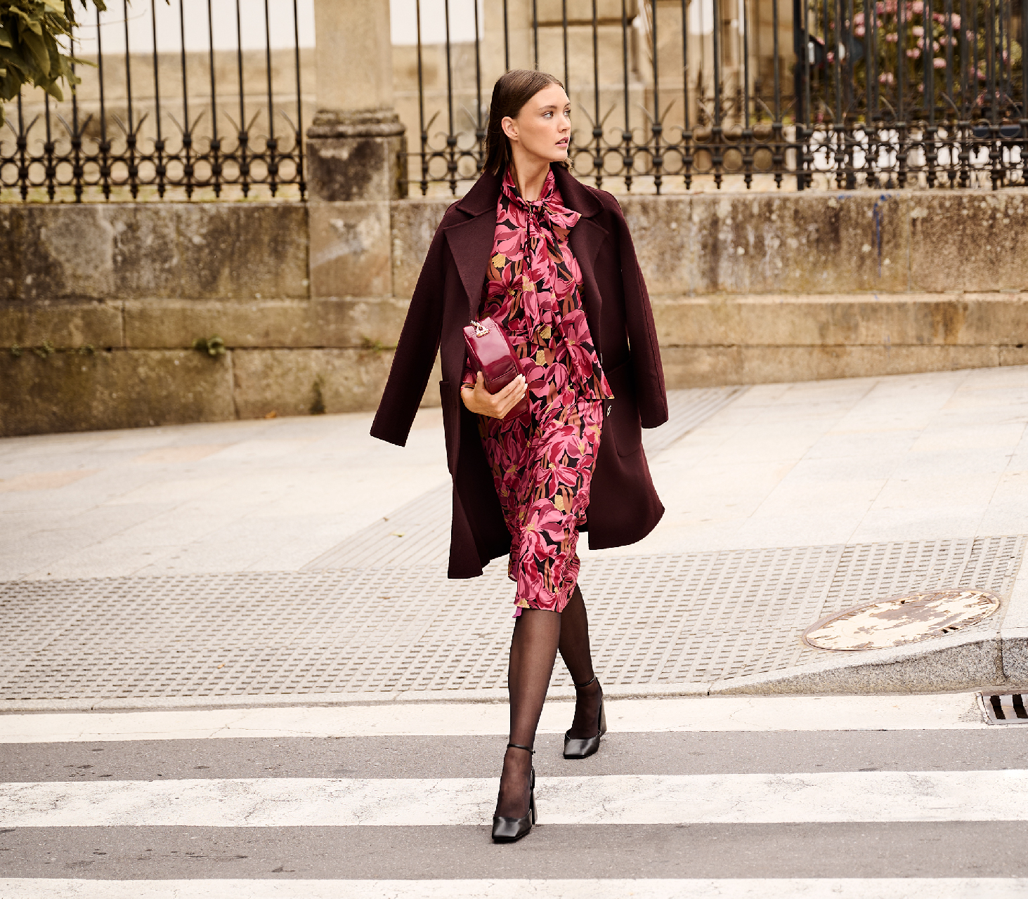 Entre las prendas clave de la nueva colección otoño-invierno 2023 encontramos piezas de piel napa en colores clásicos, como en marrón o negro, o de tendencia, como en verde o berenjena; sastrería con gran variedad de acabados combinada con camisas de satén; plisados y lazos en prendas de diseño atemporal; y conjuntos ‘dos piezas’ elaborados en punto fino o en una elegante gasa estampada. Por su parte, entre los cortes y las formas utilizadas, destacan los midi en vestidos y faldas y las siluetas femeninas de cintura marcada, una de las tendencias clave de este otoño. Las tonalidades grises, crudas, mostazas, verdes, berenjenas y camel tendrán especial protagonismo junto con el estampado floral en dos escalas distintas.