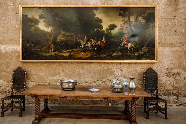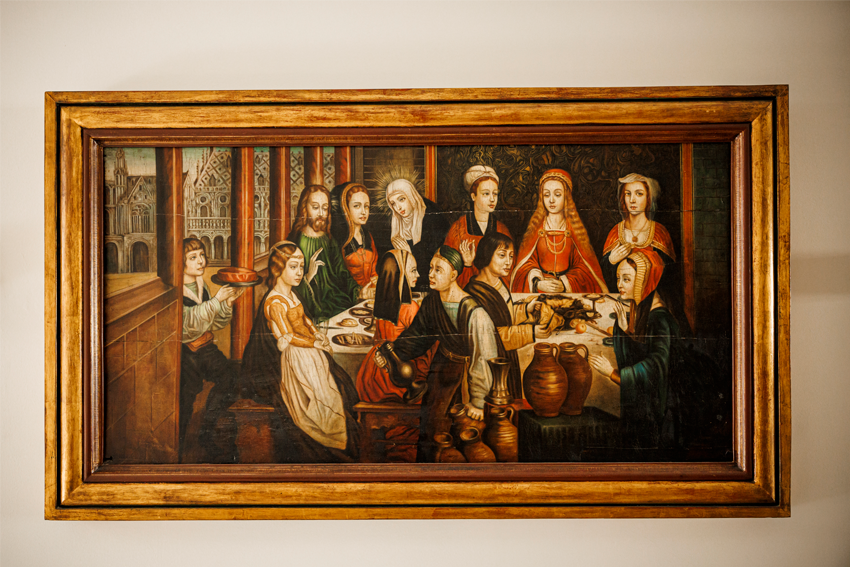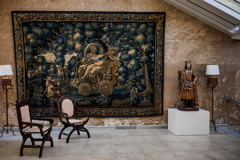 Precisamente al jardín dan dos ventanales del comedor, sobrevolado por una techumbre atravesada por vigas de madera, que se comunica a través de una enorme puerta con la cafetería y que se deconstruye, a modo de panel, para que los dos espacios se transformen en uno, único, con el fin de acoger nutridos fastos (bodas, etcétera). La cafetería, aliñada de vidrieras, ha sido uno de los actores principales de la última reforma: “Digamos que se han mantenido los toques antiguos, medievales, pero se le ha dado un lavado de cara, en plan vanguardista, los muebles se han retapizado con otro color. Siempre está abierta, en verano se cierra más tarde y la gente puede comer aquí también, y tomar algo, como merendar chocolate con churros las tardes de domingo, es una tradición”, nos explica Lucía Miguel del Corral. Esta última reforma ha terminado el pasado mes de marzo, y ha conllevado la renovación total de los baños, de las zonas comunes, fontanería, sistema eléctrico, implantación de suelo radiante, redecoración de todas las habitaciones, “hemos tocado todo, obras de arte nuevas… Porque Paradores es la única cadena hotelera que tiene una colección de arte propia, y aquí tenemos unas treinta”. De ellas, cuatro despuntan por su calidad, historia e interés: un tapiz flamenco original, del siglo XVIII, que preside la entrada y representa a la diosa Cibeles; a su lado se yergue una talla de madera policromada de un rey castellano del XVIII, pero al que los clientes reseñan con Enrique II de Trastámara, “y se hacen fotos junto a él”; de la misma época es el lienzo del lucernario que refleja una escena de caza; y el cuarto es una copia del cuadro ‘Las bodas de Caná’, de Gerard David (1511), cuyo original se guarda en el Louvre “y que mucha gente viene expresamente a verlo”, puntualiza Lucía Miguel del Corral.