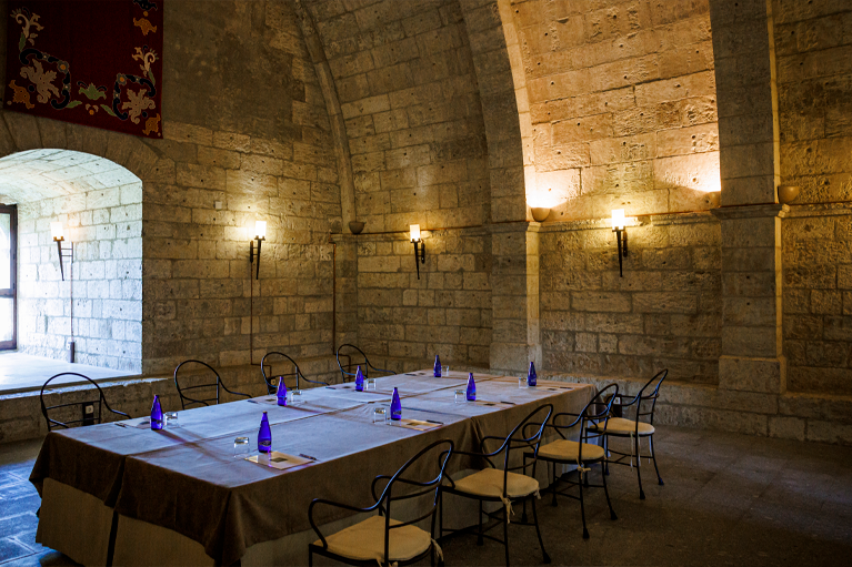Ahora también se respira envidia, pero sana, cómoda, confortable, la que produce deambular por sus estancias. Y el afán por subir: el que requiere subir sus 84 escalones estrechos, ceñidos, de piedra curtida por el tiempo y besar la cima de la ancha torre, de 17 metros de lado, coronada por almenas y matacanes y revestida por dos ventanas de arcos góticos gemelos. Es un ejercicio majestuoso y encantador que sí o sí tiene que llevar a cabo cualquiera que se aloje aquí. En la ascensión surgen dos salones. El primero es el ‘Alcázar’, en donde se nombraba al gobernante del castillo, al que se llamaba Alcalde de la Fortaleza y en el que se vislumbran, si se ajusta la mirada, las firmas de los antiguos canteros; el segundo es el ‘Imperial’, donde se recibía a los egregios invitados. Ambos son espectaculares, abovedados, empleados hoy en día para comuniones, bodas, bautizos, cócteles, de carácter más bien íntimo y se adaptan al gusto del cliente.