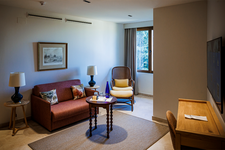 Robusta, sólida, musculosa, siempre al acecho. Así se muestra la Torre del Homenaje del Parador de Ciudad Rodrigo, un regalo del rey Enrique II de Trastámara a la localidad fronteriza reconvertido en un hospedaje calmo, orillado por el río Águeda y parapetado por una muralla que la recorre a modo de tierno abrazo. “Es uno de los paradores más antiguos de la Red, mandado construir en 1931 sobre los restos del castillo, del que se conserva la Torre del Homenaje que es un Bien de Interés Cultural, y fuera del recinto la muralla. Al mismo tiempo, también nació con la misión de crear riqueza en el entorno, de colaborar con él… Aquí estamos en plena España vaciada y el Parador es muy importante para la ciudad, es el foco de todos los eventos sociales y culturales, el gran protagonista”, nos cuenta Lucía Miguel del Corral Fregeneda, su directora. Se percibe el orgullo y el entusiasmo cuando habla de su ‘casa’, de este emblema imbuido de tranquilidad que irradia historia y cortesía a lo largo de sus 34 habitaciones, tres de ellas de categoría Junior Suite: dos en los torreones del castillo y otra de reciente construcción.