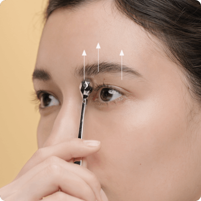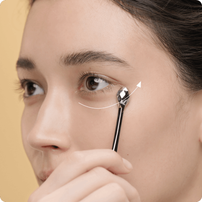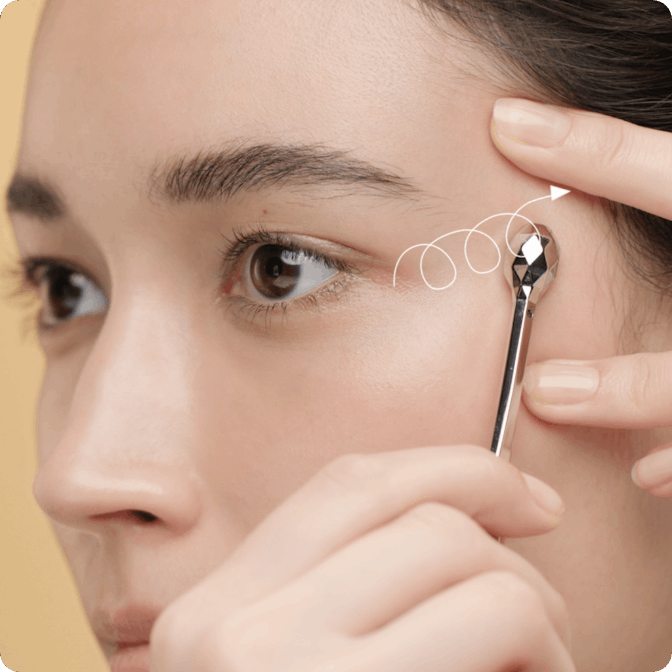 Desliza el Platinum Eye Massager desde debajo de las cejas hacia arriba, ejerciendo una suave presión. Repite tres veces en cada ojo.