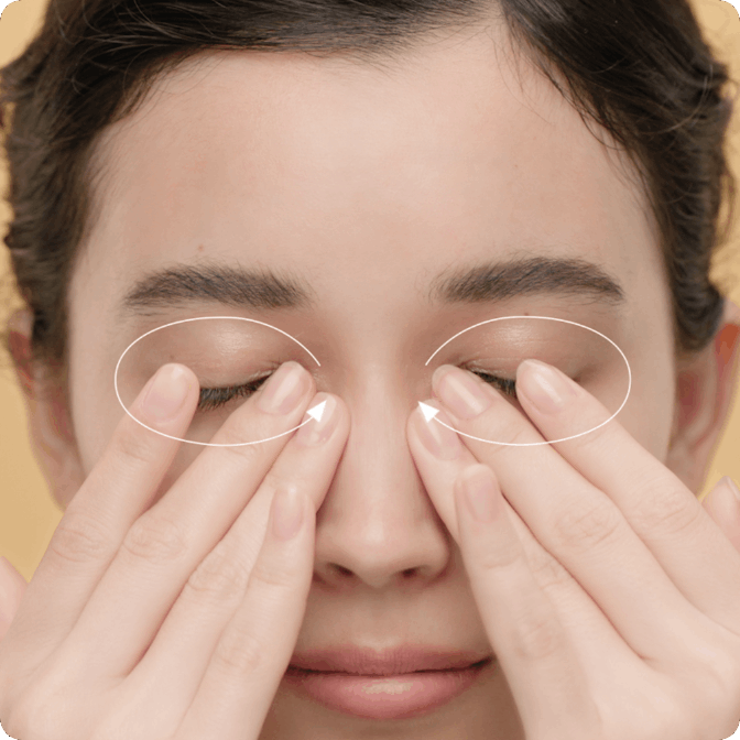 Presiona suavemente comenzando por debajo del ángulo interno del ojo con el dedo anular y, a continuación, desliza lentamente alrededor de los ojos. Repite tres veces y, a continuación, presiona ligeramente las sienes.