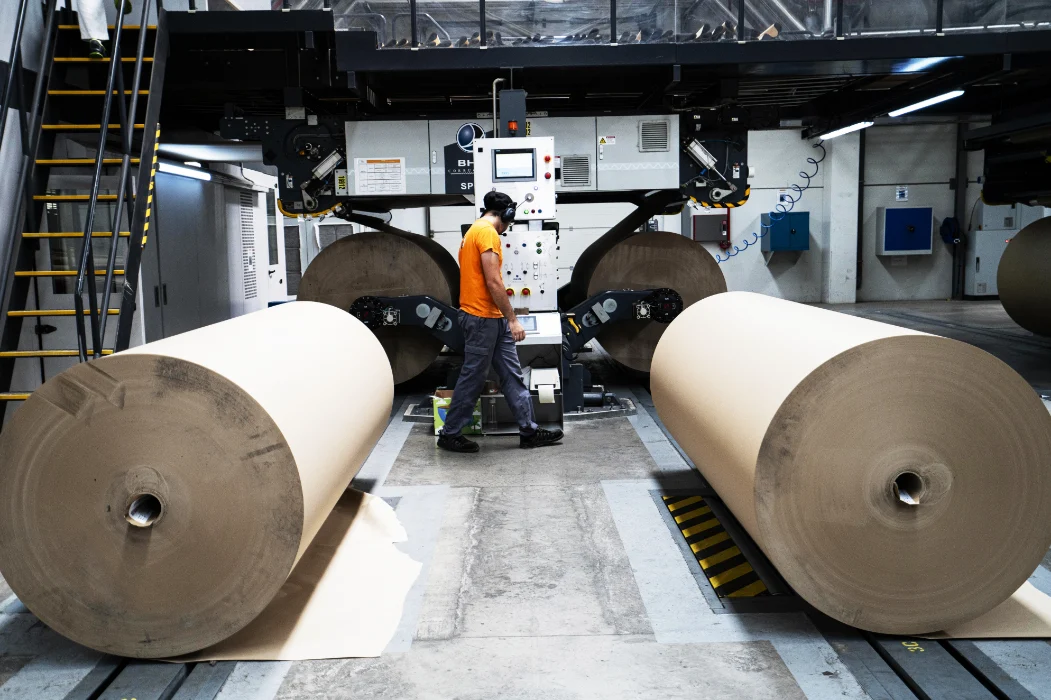 Bobinas de papel esperan frente a la onduladora, listas para iniciar el proceso que transformará la materia prima en cartón ondulado. La instalación de la primera máquina en 1981 marcó un hito en la historia de la empresa, al permitirle producir internamente y dar un salto decisivo en su desarrollo industrial.