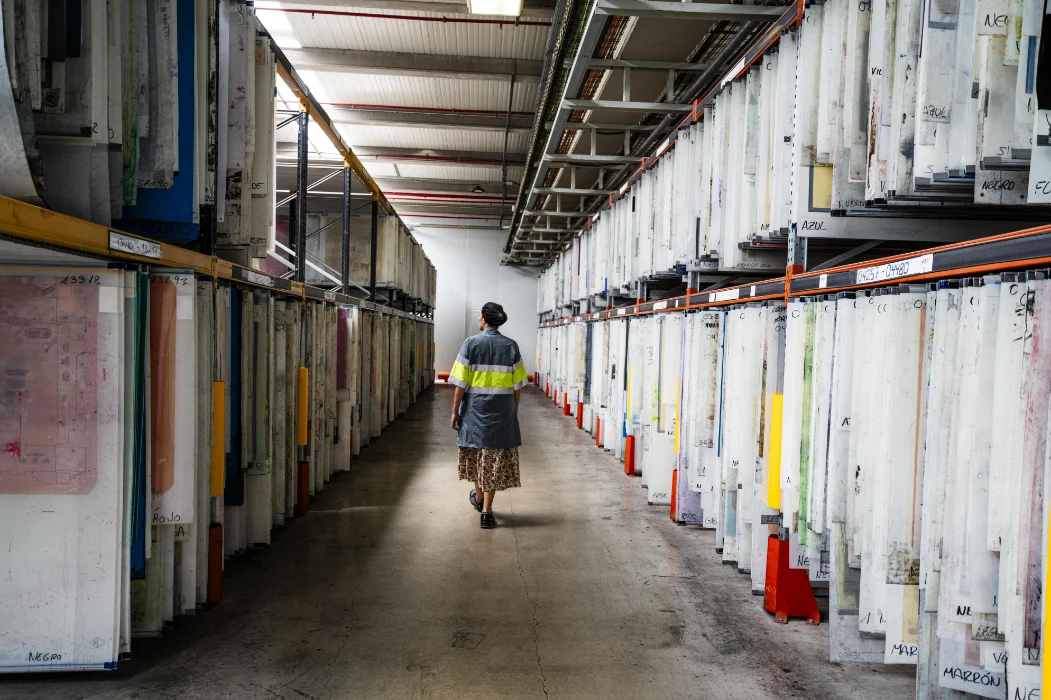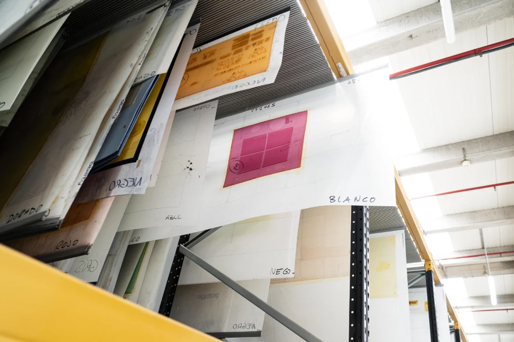 La Plana se encarga de la producción e impresión del cartón, el troquelado y el pegado de las piezas. En la imagen, los clichés utilizados en la impresión flexográfica: planchas de goma que se adaptan a un cilindro para transferir la tinta directamente sobre el cartón ondulado. Cada color requiere un cliché distinto, que después se almacena colgado para garantizar su conservación y reutilización en futuros pedidos, asegurando rapidez y calidad en cada tirada.