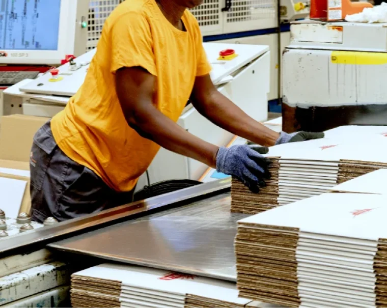 Una operadora revisa y prepara las cajas recién plegadas y pegadas, en el paso previo al flejado y paletizado.