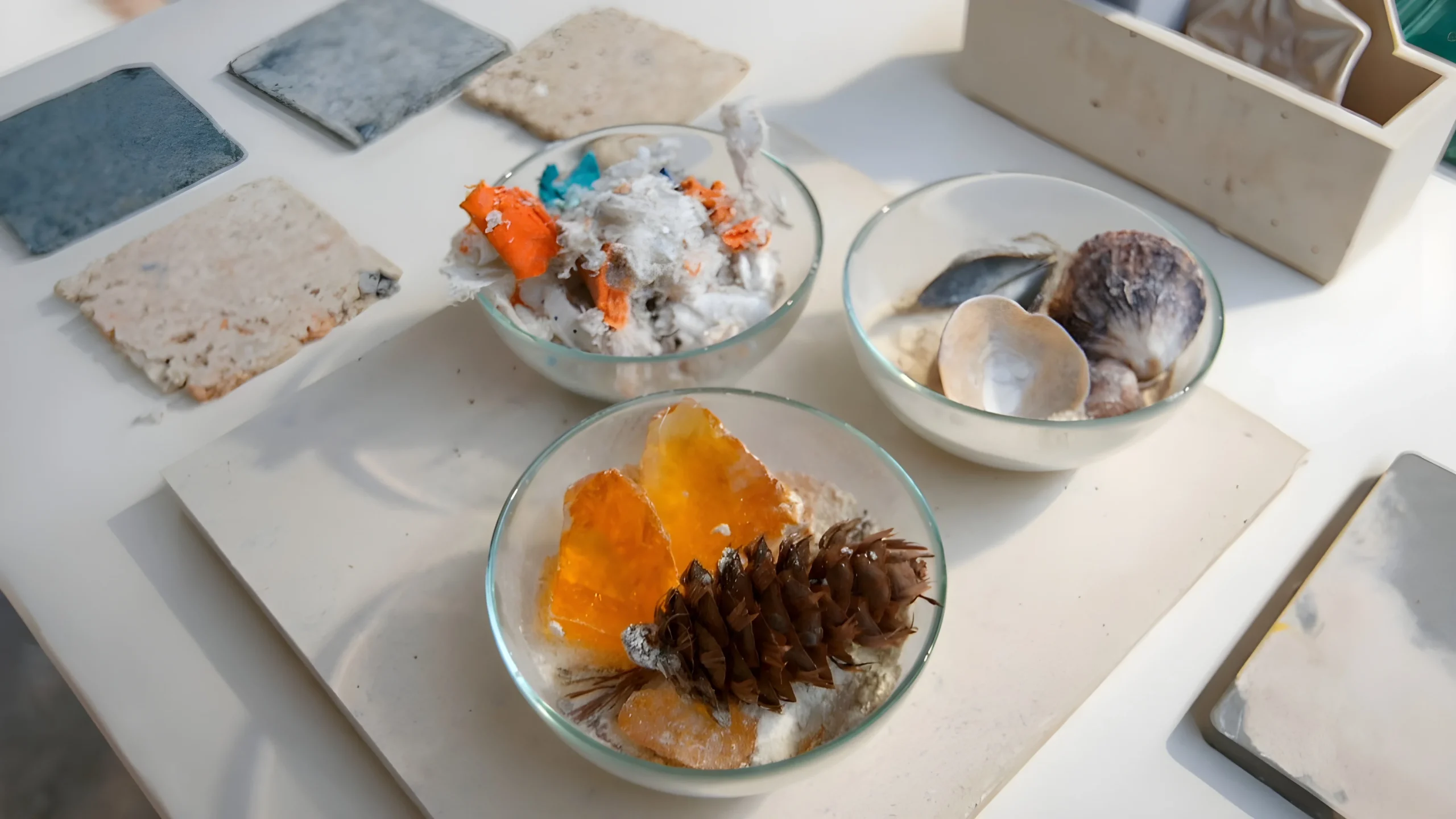 “Para ser realmente sostenible, tienes que ayudar a las empresas con sus desechos, que muchas veces no saben qué hacer con ellos. Antes te pedían un proyecto sostenible y buscabas un proveedor para comprar un tablero reciclado. Pero al final nos hicimos esta pregunta: ¿reciclado de dónde? Este tablero está hecho con pipas, pero ¿dónde se comieron esas pipas, en España o en China?” García Bodaño insiste en la necesidad de que los nuevos materiales se realicen aquí, “con los desechos y los artesanos de la zona”. A día de hoy pueden presumir de tener dos materiales patentados: el Recycled Textile Panel, una plancha creada por termoconformado a partir de textiles reciclados, y el Recycled Textile Stone, un material fabricado con resina de pino obtenida en la España vaciada y conchas de mejillón recuperadas de la industria conservera gallega. “Ahora a todas las empresas se les exige ser sostenibles y todas ellas tienen desechos, y ahí es donde entramos nosotros. Les ayudamos a gestionarlos”.