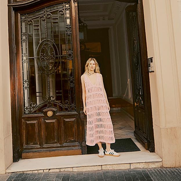 En el extremo opuesto, pero sin perder esa esencia bohemia que domirá las tendencias de la primavera, este maravilloso vestido rosa suave en tejido calado y largo midi de Chanel que se lleva con collar de cadenas de la maison y unas deportivas Adidas que ponen el toque urbano al conjunto.