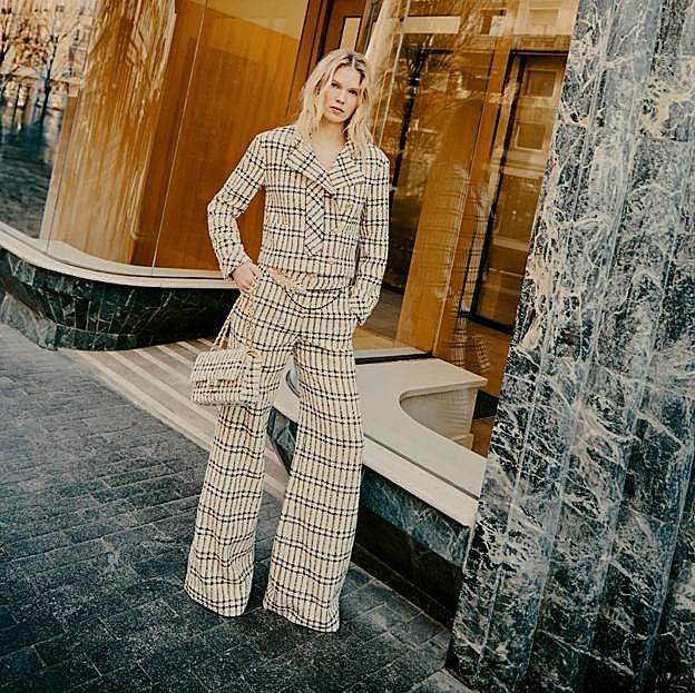 Si nos fijamos en los tejidos el tweed, seña de identidad indiscutible de la maison Chanel, también llega a los looks de primavera. En este caso, con un conjunto elegantísimo y efecto tipazo con traje de chaqueta corta y pantalones palazzo estampados a juego con uno de los icónicos bolsos de la firma. Como detalle, el cinturón a la cadera que combina metal y piel.