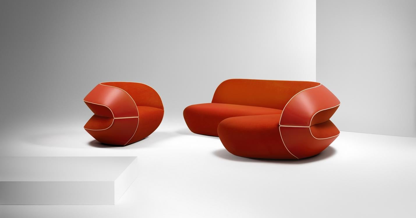 El sillón, inspirado en el icónico Medallón, se revela en diferentes materiales y colores (aluminio pulido o lacado, tejido bouclé crudo y toile de Jouy rosa, negro o naranja fluorescente), y se combina con la colección de mobiliario más completa jamás creada por la maison Dior.