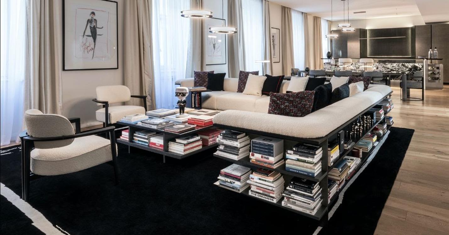 ¿Nuestro favorito? El sofá Saint Germain para tres personas, que también funciona como una pequeña biblioteca, con lados que abarcan estantes incorporados decorativos para libros apilados horizontalmente. El diseño está inspirado en el amor de Karl Lagerfeld por los libros, y cómo los exhibió, ya que su colección personal acumuló más de 300.000 volúmenes.