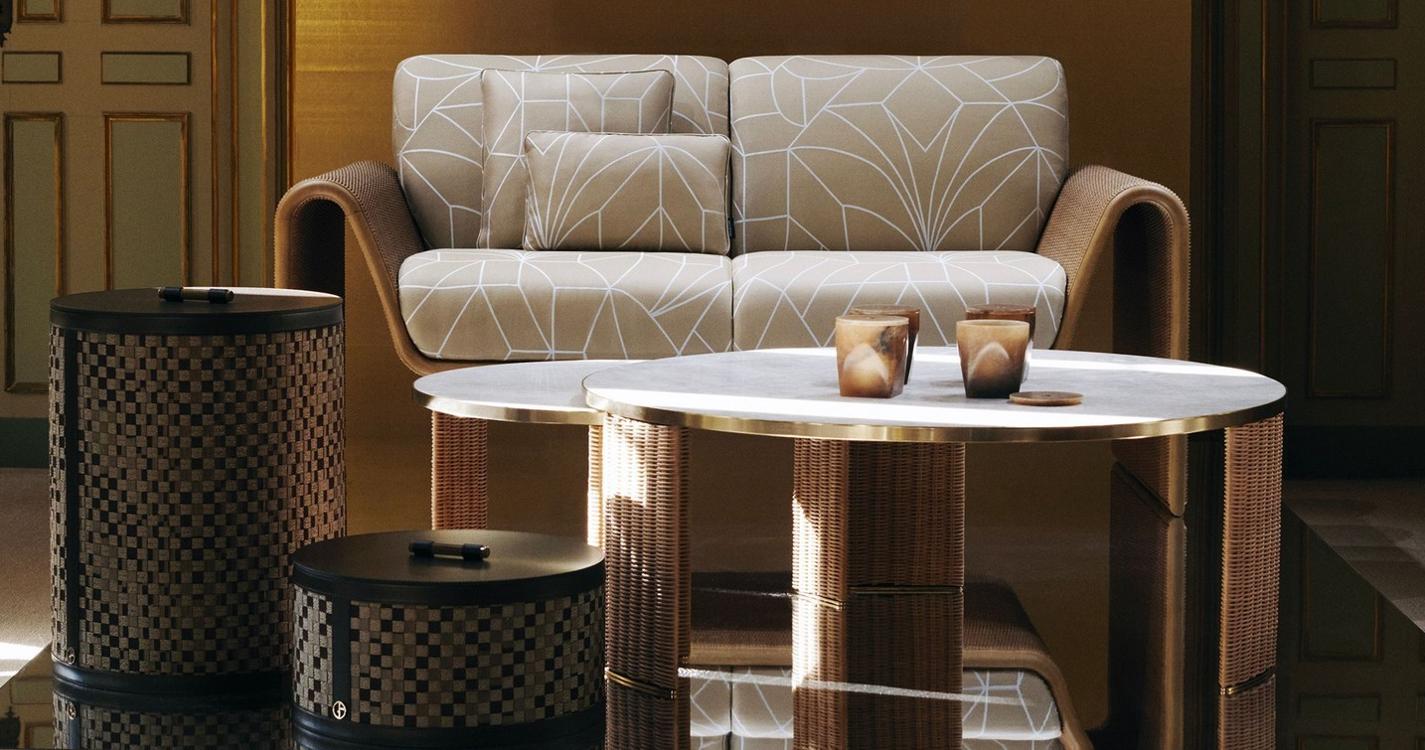 En el interior del edificio, el visitante se sumerge de inmediato en un ambiente único e íntimo. En el jardín secreto encontramos la primera colección Armani/Casa enteramente dedicada al exterior. Siguiendo el camino a través del patio y los pórticos, los huéspedes son conducidos a las salas del primer piso que forman parte del atelier Armani Privé, donde encontramos piezas de mimbre de líneas curvas que resaltan la transición del exterior al interior con sutiles variaciones de tonos neutros. En las siguientes salas, las piezas más codiciadas: nuevas ediciones de muebles icónicos elaborados con materiales exquisitos y con la misma mano de obra artesanal que una creación de Alta Costura.