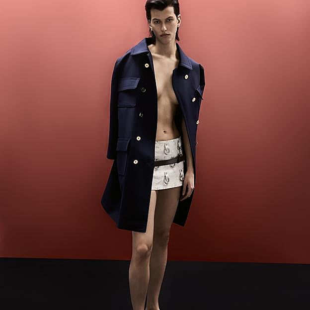 Con un aire también irreverente, pero dulcificado en este caso con notas muy femeninas y románticas encontramos esta inesperada combinación de gabardina, minifalda de piel con adorno de cinturón y mocasines firmado por Prada.