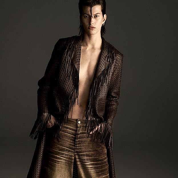 Los flecos son uno de los detalles que marcan la tendencia esta primavera, y Roberto Cavalli juega con maestrçia con ellos en este imponente abrigo de piel trenzada en color marrón, otro de los tonos que marcan la pauta de la temporada. Los vaqueros también son de la firma italiana y casan a las mil maravillas.