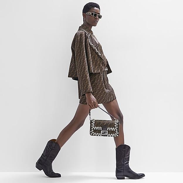 Sabemos que estamos en tiempos de discreción y lujo silencioso, pero si eres de las que ama los monogram y le gusta presumir de marca, nada como un total look como este de Fendi, con cazadora, minifalda, su icónico bolso Baguette y unas botas cowboy. Más tendencia, imposible. Como imposible será pasar desapercibida con él...