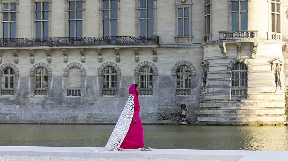 Primero, porque el diseñador de Valentino ha sacado el desfile de la propia ciudad de París y se ha ido a una hora de camino, al Château de Chantilly. Segundo, y mucho más transgresor, porque ha abierto el show, en los regios jardines y ante toda la aristocracia de la moda, con el castillo presidiendo la escena, con la reina Kaia Gerber en vaqueros y con una camisa blanca. Sí, Piccioli ha abierto el desfile de alta costura de la firma italiana de lujo por antonomasia con un look en vaqueros. ¿Quién puede igualar este órdago?