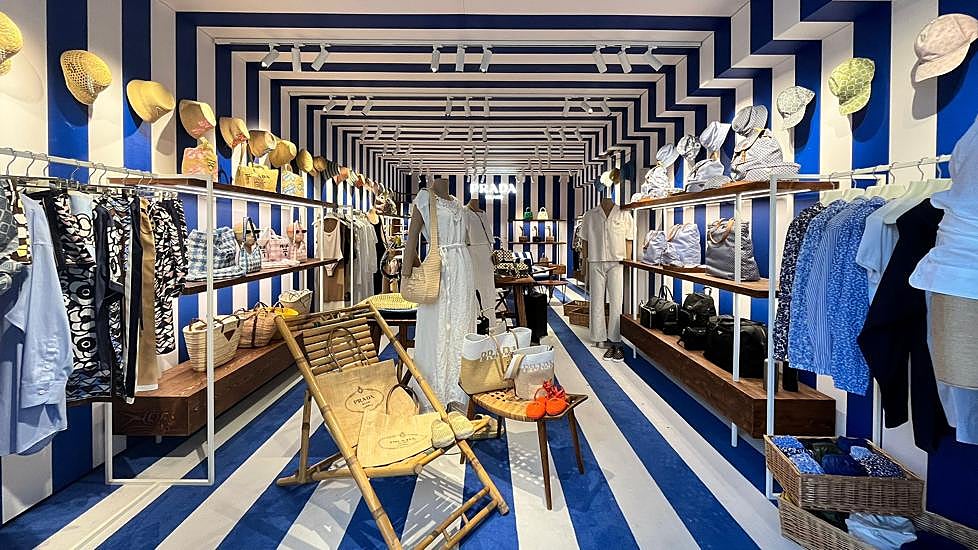 Con una exclusiva selección especial de ropa, bolsos, calzado y accesorios de la firma de lujo, y con un brillante contraste cromático entre el blanco y el azul, enfatizado por juegos de luces y motivos gráficos a rayas, esta tienda efímera revisa los códigos visuales de la marca en clave contemporánea.