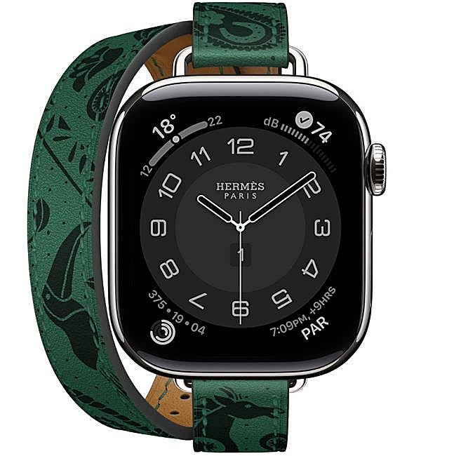 La colaboración entre Hermès y Apple no es nueva, de hecho, la unión entre ambas casas celebra 10 años de éxitos. Este 2025, han lanzado de forma conjunta nuevos modelos del Apple Watch, en concreto el Series 11, junto a la prestigiosa firma parisina de artículos de lujo. En la imagen, Animaux Bandana, recrea la estética de los icónicos carrés de Hermès, en la muñeca.