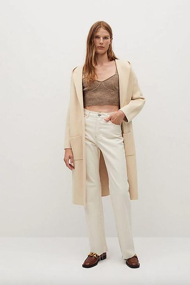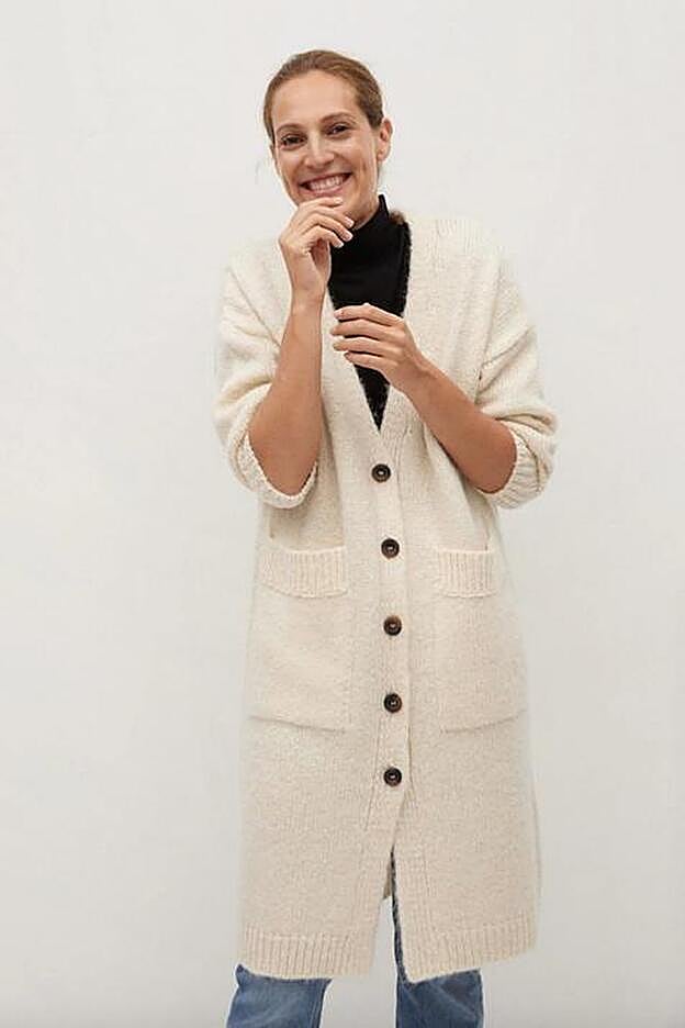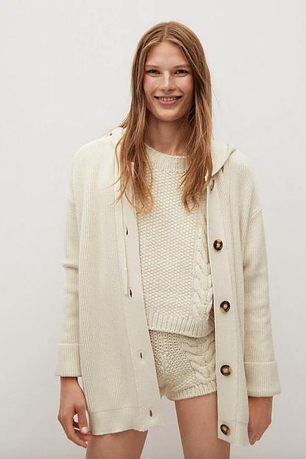 El cárdigan más corto de esta selección es este que termina en los muslos y viene con capucha y diseño ancho de canalé. Con costura de hombro caída, el cierre frontal es con botones en efecto carey. De color crudo, tiene un precio de 69,99 euros y está disponible en las tallas S, M y L.