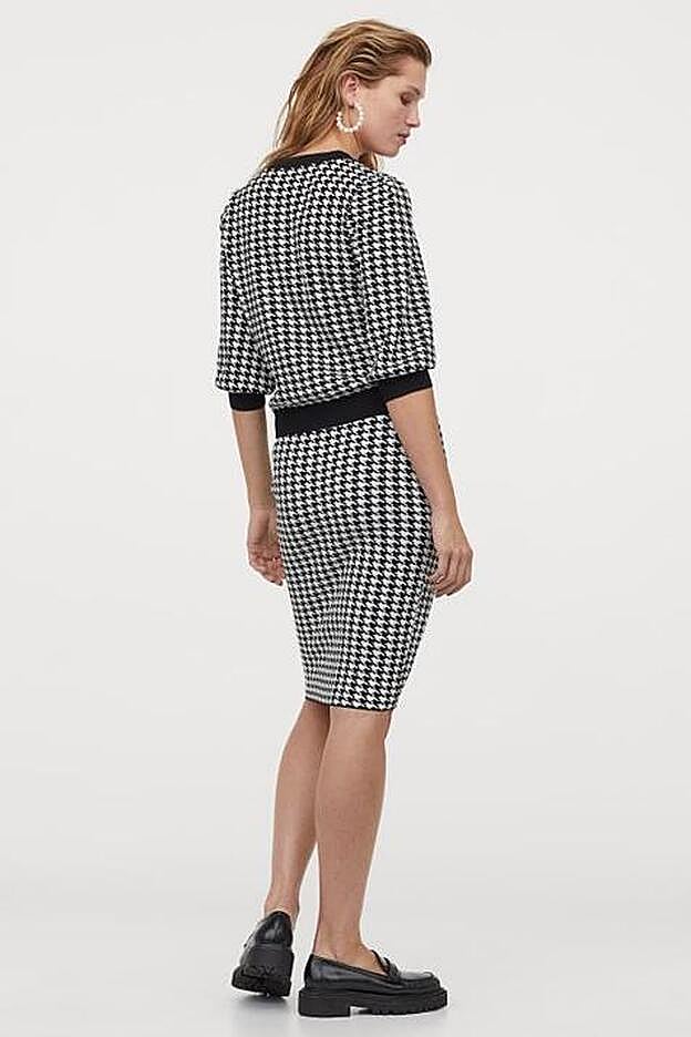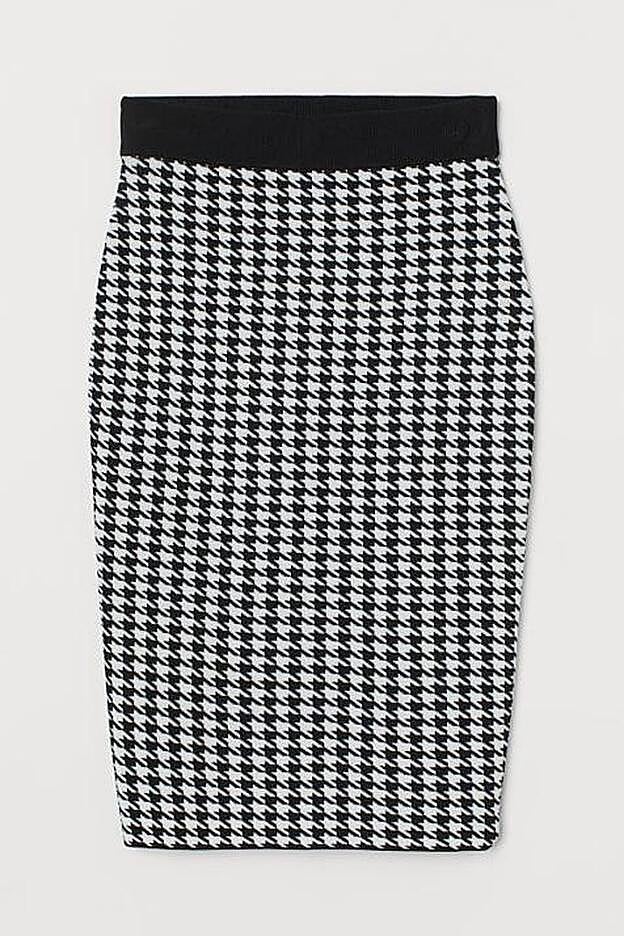 La falda, confeccionada en punto de jacquard suave, tiene el talle alto y elástico revestido en la cintura en color negro. De largo hasta la rodilla, tiene un precio de 29,99 euros y está disponible entre las tallas XS y XXL.